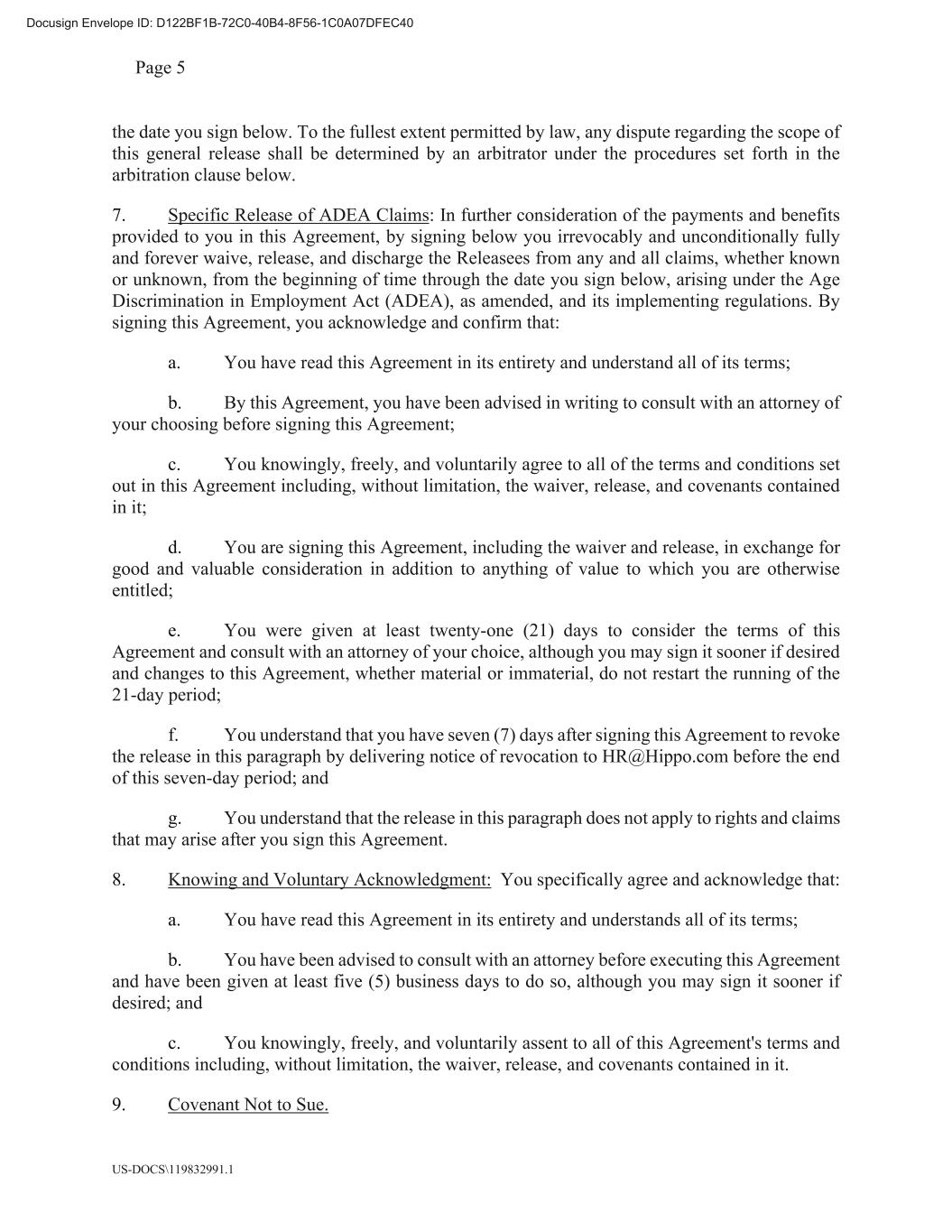 Page 5 US-DOCS\119832991.1 the date you sign below. To the fullest extent permitted by law, any dispute regarding the scope of this general release shall be determined by an arbitrator under the procedures set forth in the arbitration clause below. 7. Specific Release of ADEA Claims: In further consideration of the payments and benefits provided to you in this Agreement, by signing below you irrevocably and unconditionally fully and forever waive, release, and discharge the Releasees from any and all claims, whether known or unknown, from the beginning of time through the date you sign below, arising under the Age Discrimination in Employment Act (ADEA), as amended, and its implementing regulations. By signing this Agreement, you acknowledge and confirm that: a. You have read this Agreement in its entirety and understand all of its terms; b. By this Agreement, you have been advised in writing to consult with an attorney of your choosing before signing this Agreement; c. You knowingly, freely, and voluntarily agree to all of the terms and conditions set out in this Agreement including, without limitation, the waiver, release, and covenants contained in it; d. You are signing this Agreement, including the waiver and release, in exchange for good and valuable consideration in addition to anything of value to which you are otherwise entitled; e. You were given at least twenty-one (21) days to consider the terms of this Agreement and consult with an attorney of your choice, although you may sign it sooner if desired and changes to this Agreement, whether material or immaterial, do not restart the running of the 21-day period; f. You understand that you have seven (7) days after signing this Agreement to revoke the release in this paragraph by delivering notice of revocation to HR@Hippo.com before the end of this seven-day period; and g. You understand that the release in this paragraph does not apply to rights and claims that may arise after you sign this Agreement. 8. Knowing and Voluntary Acknowledgment: You specifically agree and acknowledge that: a. You have read this Agreement in its entirety and understands all of its terms; b. You have been advised to consult with an attorney before executing this Agreement and have been given at least five (5) business days to do so, although you may sign it sooner if desired; and c. You knowingly, freely, and voluntarily assent to all of this Agreement's terms and conditions including, without limitation, the waiver, release, and covenants contained in it. 9. Covenant Not to Sue.