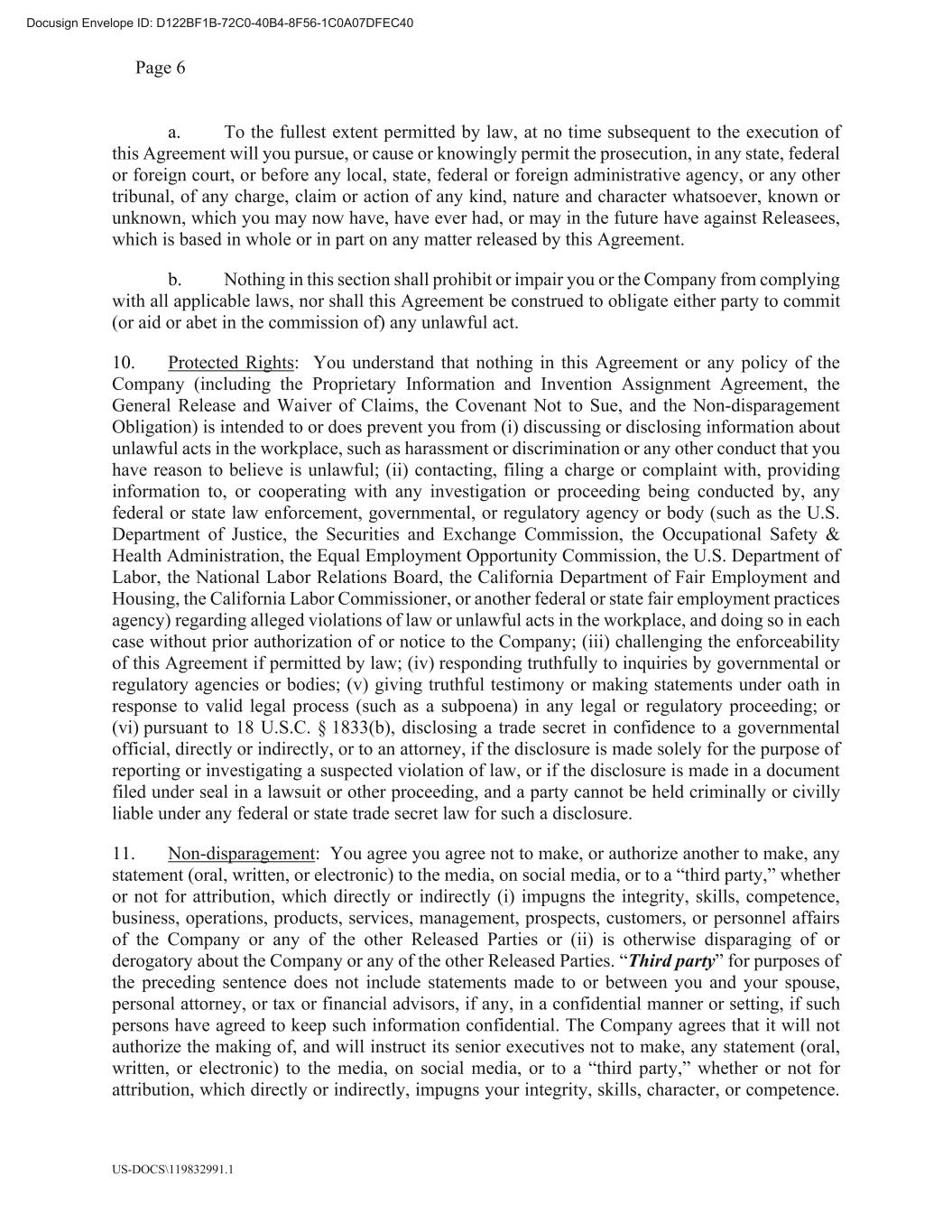 Page 6 US-DOCS\119832991.1 a. To the fullest extent permitted by law, at no time subsequent to the execution of this Agreement will you pursue, or cause or knowingly permit the prosecution, in any state, federal or foreign court, or before any local, state, federal or foreign administrative agency, or any other tribunal, of any charge, claim or action of any kind, nature and character whatsoever, known or unknown, which you may now have, have ever had, or may in the future have against Releasees, which is based in whole or in part on any matter released by this Agreement. b. Nothing in this section shall prohibit or impair you or the Company from complying with all applicable laws, nor shall this Agreement be construed to obligate either party to commit (or aid or abet in the commission of) any unlawful act. 10. Protected Rights: You understand that nothing in this Agreement or any policy of the Company (including the Proprietary Information and Invention Assignment Agreement, the General Release and Waiver of Claims, the Covenant Not to Sue, and the Non-disparagement Obligation) is intended to or does prevent you from (i) discussing or disclosing information about unlawful acts in the workplace, such as harassment or discrimination or any other conduct that you have reason to believe is unlawful; (ii) contacting, filing a charge or complaint with, providing information to, or cooperating with any investigation or proceeding being conducted by, any federal or state law enforcement, governmental, or regulatory agency or body (such as the U.S. Department of Justice, the Securities and Exchange Commission, the Occupational Safety & Health Administration, the Equal Employment Opportunity Commission, the U.S. Department of Labor, the National Labor Relations Board, the California Department of Fair Employment and Housing, the California Labor Commissioner, or another federal or state fair employment practices agency) regarding alleged violations of law or unlawful acts in the workplace, and doing so in each case without prior authorization of or notice to the Company; (iii) challenging the enforceability of this Agreement if permitted by law; (iv) responding truthfully to inquiries by governmental or regulatory agencies or bodies; (v) giving truthful testimony or making statements under oath in response to valid legal process (such as a subpoena) in any legal or regulatory proceeding; or (vi) pursuant to 18 U.S.C. § 1833(b), disclosing a trade secret in confidence to a governmental official, directly or indirectly, or to an attorney, if the disclosure is made solely for the purpose of reporting or investigating a suspected violation of law, or if the disclosure is made in a document filed under seal in a lawsuit or other proceeding, and a party cannot be held criminally or civilly liable under any federal or state trade secret law for such a disclosure. 11. Non-disparagement: You agree you agree not to make, or authorize another to make, any statement (oral, written, or electronic) to the media, on social media, or to a “third party,” whether or not for attribution, which directly or indirectly (i) impugns the integrity, skills, competence, business, operations, products, services, management, prospects, customers, or personnel affairs of the Company or any of the other Released Parties or (ii) is otherwise disparaging of or derogatory about the Company or any of the other Released Parties. “Third party” for purposes of the preceding sentence does not include statements made to or between you and your spouse, personal attorney, or tax or financial advisors, if any, in a confidential manner or setting, if such persons have agreed to keep such information confidential. The Company agrees that it will not authorize the making of, and will instruct its senior executives not to make, any statement (oral, written, or electronic) to the media, on social media, or to a “third party,” whether or not for attribution, which directly or indirectly, impugns your integrity, skills, character, or competence.