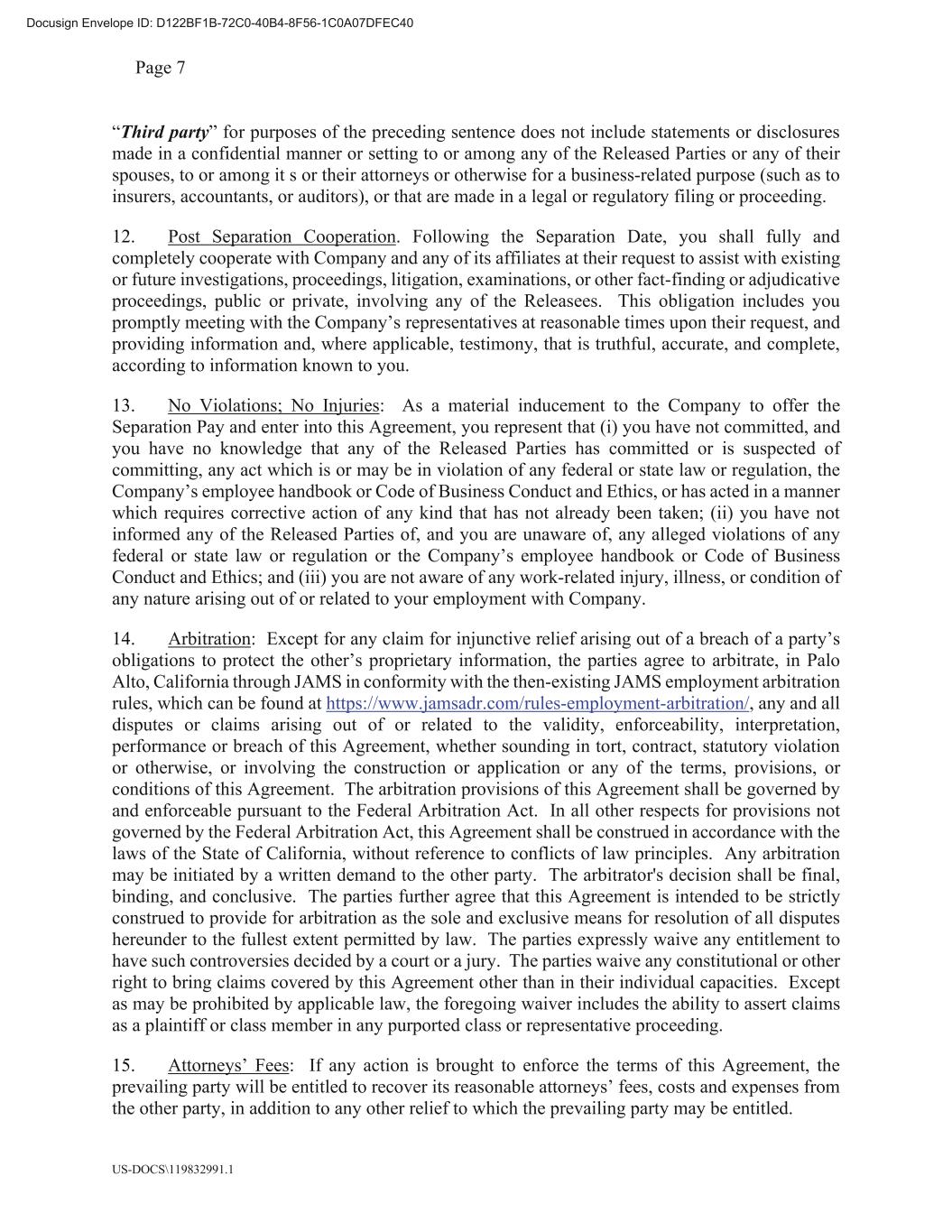 Page 7 US-DOCS\119832991.1 “Third party” for purposes of the preceding sentence does not include statements or disclosures made in a confidential manner or setting to or among any of the Released Parties or any of their spouses, to or among it s or their attorneys or otherwise for a business-related purpose (such as to insurers, accountants, or auditors), or that are made in a legal or regulatory filing or proceeding. 12. Post Separation Cooperation. Following the Separation Date, you shall fully and completely cooperate with Company and any of its affiliates at their request to assist with existing or future investigations, proceedings, litigation, examinations, or other fact-finding or adjudicative proceedings, public or private, involving any of the Releasees. This obligation includes you promptly meeting with the Company’s representatives at reasonable times upon their request, and providing information and, where applicable, testimony, that is truthful, accurate, and complete, according to information known to you. 13. No Violations; No Injuries: As a material inducement to the Company to offer the Separation Pay and enter into this Agreement, you represent that (i) you have not committed, and you have no knowledge that any of the Released Parties has committed or is suspected of committing, any act which is or may be in violation of any federal or state law or regulation, the Company’s employee handbook or Code of Business Conduct and Ethics, or has acted in a manner which requires corrective action of any kind that has not already been taken; (ii) you have not informed any of the Released Parties of, and you are unaware of, any alleged violations of any federal or state law or regulation or the Company’s employee handbook or Code of Business Conduct and Ethics; and (iii) you are not aware of any work-related injury, illness, or condition of any nature arising out of or related to your employment with Company. 14. Arbitration: Except for any claim for injunctive relief arising out of a breach of a party’s obligations to protect the other’s proprietary information, the parties agree to arbitrate, in Palo Alto, California through JAMS in conformity with the then-existing JAMS employment arbitration rules, which can be found at https://www.jamsadr.com/rules-employment-arbitration/, any and all disputes or claims arising out of or related to the validity, enforceability, interpretation, performance or breach of this Agreement, whether sounding in tort, contract, statutory violation or otherwise, or involving the construction or application or any of the terms, provisions, or conditions of this Agreement. The arbitration provisions of this Agreement shall be governed by and enforceable pursuant to the Federal Arbitration Act. In all other respects for provisions not governed by the Federal Arbitration Act, this Agreement shall be construed in accordance with the laws of the State of California, without reference to conflicts of law principles. Any arbitration may be initiated by a written demand to the other party. The arbitrator's decision shall be final, binding, and conclusive. The parties further agree that this Agreement is intended to be strictly construed to provide for arbitration as the sole and exclusive means for resolution of all disputes hereunder to the fullest extent permitted by law. The parties expressly waive any entitlement to have such controversies decided by a court or a jury. The parties waive any constitutional or other right to bring claims covered by this Agreement other than in their individual capacities. Except as may be prohibited by applicable law, the foregoing waiver includes the ability to assert claims as a plaintiff or class member in any purported class or representative proceeding. 15. Attorneys’ Fees: If any action is brought to enforce the terms of this Agreement, the prevailing party will be entitled to recover its reasonable attorneys’ fees, costs and expenses from the other party, in addition to any other relief to which the prevailing party may be entitled.