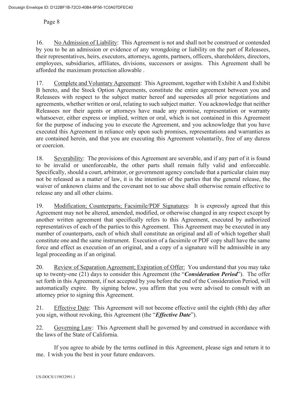 Page 8 US-DOCS\119832991.1 16. No Admission of Liability: This Agreement is not and shall not be construed or contended by you to be an admission or evidence of any wrongdoing or liability on the part of Releasees, their representatives, heirs, executors, attorneys, agents, partners, officers, shareholders, directors, employees, subsidiaries, affiliates, divisions, successors or assigns. This Agreement shall be afforded the maximum protection allowable . 17. Complete and Voluntary Agreement: This Agreement, together with Exhibit A and Exhibit B hereto, and the Stock Option Agreements, constitute the entire agreement between you and Releasees with respect to the subject matter hereof and supersedes all prior negotiations and agreements, whether written or oral, relating to such subject matter. You acknowledge that neither Releasees nor their agents or attorneys have made any promise, representation or warranty whatsoever, either express or implied, written or oral, which is not contained in this Agreement for the purpose of inducing you to execute the Agreement, and you acknowledge that you have executed this Agreement in reliance only upon such promises, representations and warranties as are contained herein, and that you are executing this Agreement voluntarily, free of any duress or coercion. 18. Severability: The provisions of this Agreement are severable, and if any part of it is found to be invalid or unenforceable, the other parts shall remain fully valid and enforceable. Specifically, should a court, arbitrator, or government agency conclude that a particular claim may not be released as a matter of law, it is the intention of the parties that the general release, the waiver of unknown claims and the covenant not to sue above shall otherwise remain effective to release any and all other claims. 19. Modification; Counterparts; Facsimile/PDF Signatures: It is expressly agreed that this Agreement may not be altered, amended, modified, or otherwise changed in any respect except by another written agreement that specifically refers to this Agreement, executed by authorized representatives of each of the parties to this Agreement. This Agreement may be executed in any number of counterparts, each of which shall constitute an original and all of which together shall constitute one and the same instrument. Execution of a facsimile or PDF copy shall have the same force and effect as execution of an original, and a copy of a signature will be admissible in any legal proceeding as if an original. 20. Review of Separation Agreement; Expiration of Offer: You understand that you may take up to twenty-one (21) days to consider this Agreement (the “Consideration Period”). The offer set forth in this Agreement, if not accepted by you before the end of the Consideration Period, will automatically expire. By signing below, you affirm that you were advised to consult with an attorney prior to signing this Agreement. 21. Effective Date: This Agreement will not become effective until the eighth (8th) day after you sign, without revoking, this Agreement (the “Effective Date”). 22. Governing Law: This Agreement shall be governed by and construed in accordance with the laws of the State of California. If you agree to abide by the terms outlined in this Agreement, please sign and return it to me. I wish you the best in your future endeavors.