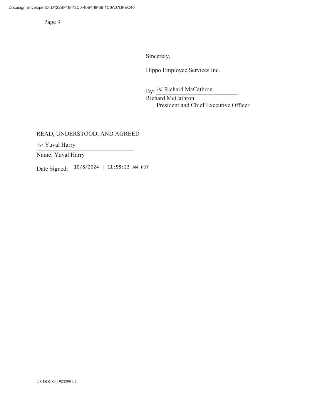 Page 9 US-DOCS\119832991.1 Sincerely, Hippo Employee Services Inc. By: ___________________________ Richard McCathron President and Chief Executive Officer READ, UNDERSTOOD, AND AGREED ________________________________ Name: Yuval Harry Date Signed: __________________ /s/ Richard McCathron /s/ Yuval Harry