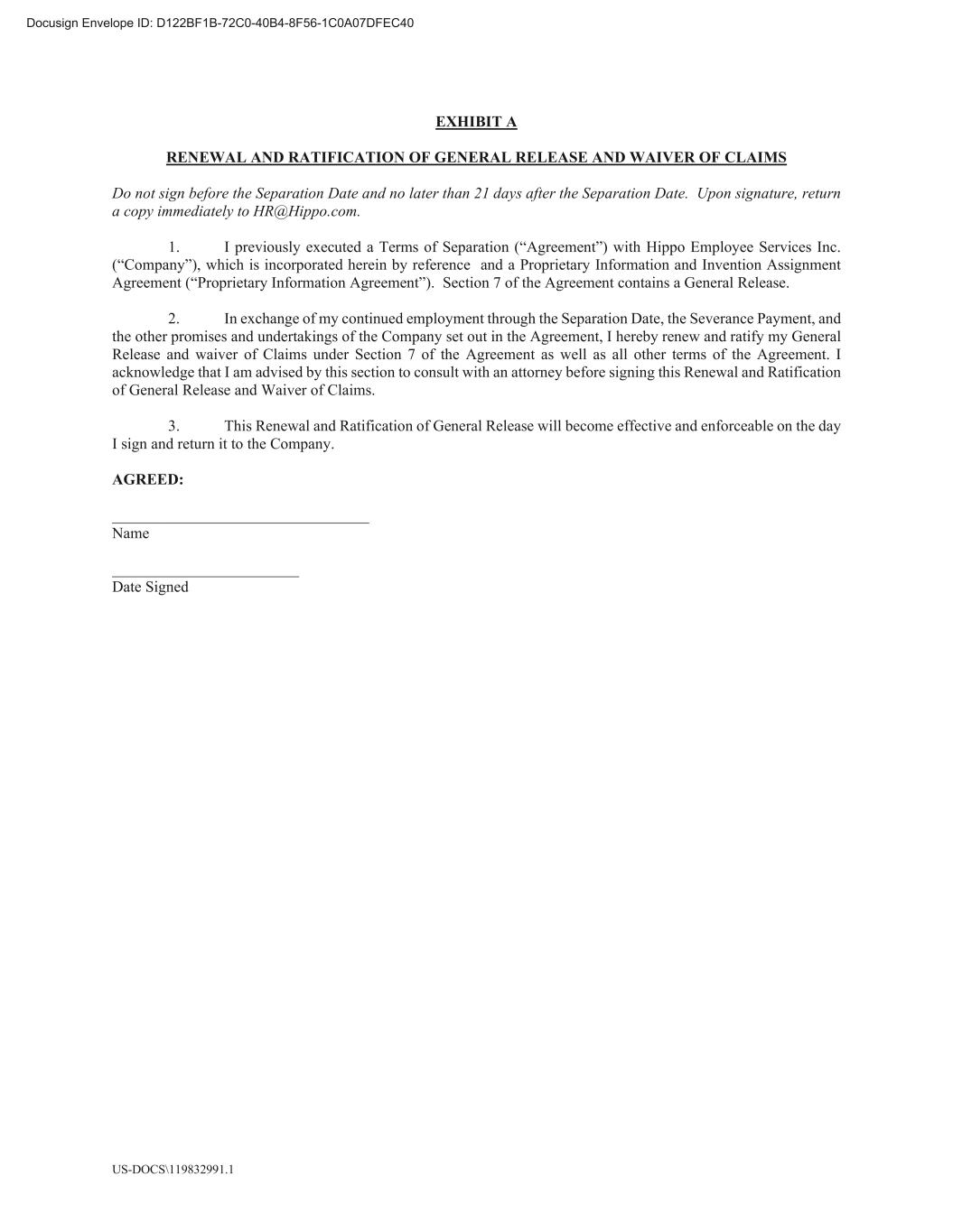 US-DOCS\119832991.1 EXHIBIT A RENEWAL AND RATIFICATION OF GENERAL RELEASE AND WAIVER OF CLAIMS Do not sign before the Separation Date and no later than 21 days after the Separation Date. Upon signature, return a copy immediately to HR@Hippo.com. 1. I previously executed a Terms of Separation (“Agreement”) with Hippo Employee Services Inc. (“Company”), which is incorporated herein by reference and a Proprietary Information and Invention Assignment Agreement (“Proprietary Information Agreement”). Section 7 of the Agreement contains a General Release. 2. In exchange of my continued employment through the Separation Date, the Severance Payment, and the other promises and undertakings of the Company set out in the Agreement, I hereby renew and ratify my General Release and waiver of Claims under Section 7 of the Agreement as well as all other terms of the Agreement. I acknowledge that I am advised by this section to consult with an attorney before signing this Renewal and Ratification of General Release and Waiver of Claims. 3. This Renewal and Ratification of General Release will become effective and enforceable on the day I sign and return it to the Company. AGREED: _________________________________ Name ________________________ Date Signed