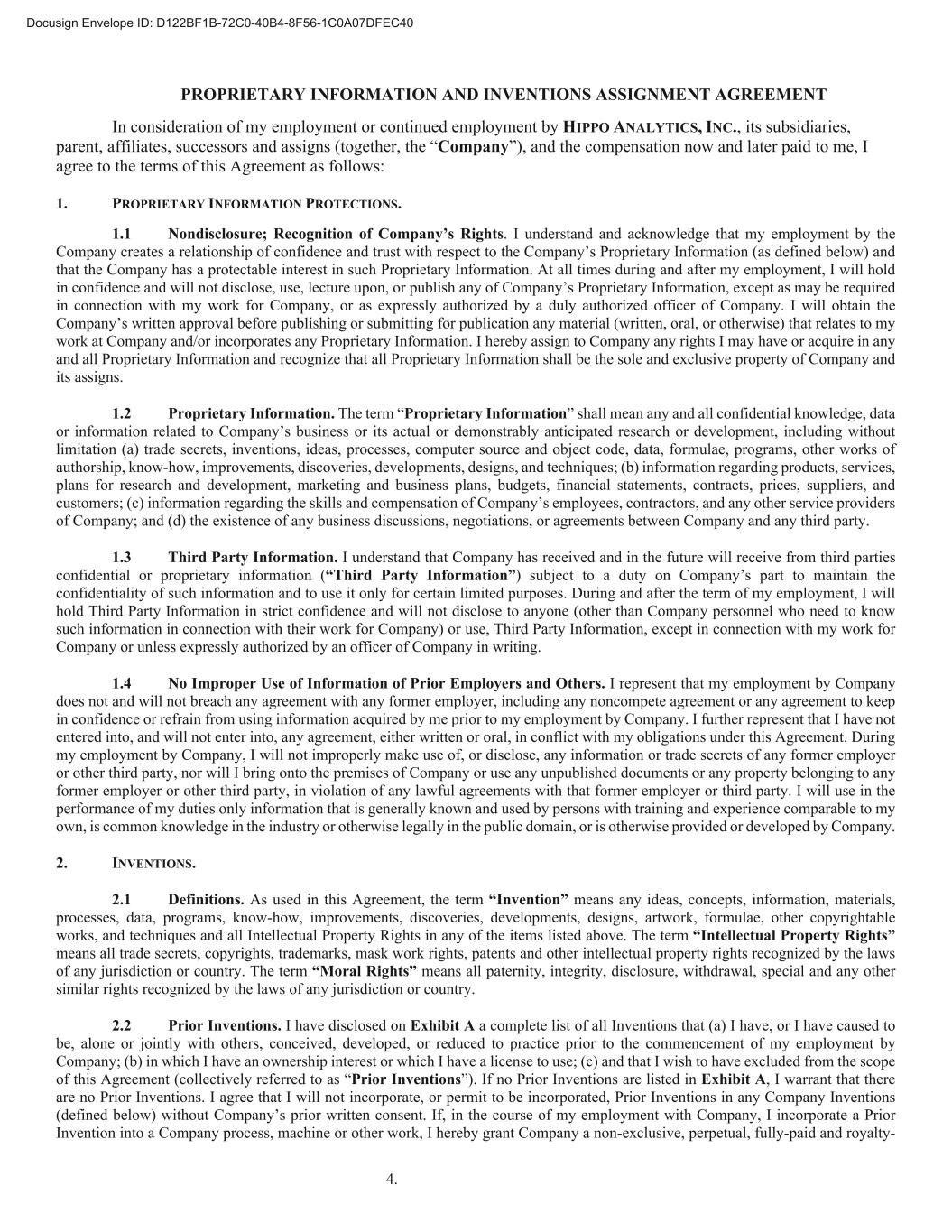 4. PROPRIETARY INFORMATION AND INVENTIONS ASSIGNMENT AGREEMENT In consideration of my employment or continued employment by HIPPO ANALYTICS, INC., its subsidiaries, parent, affiliates, successors and assigns (together, the “Company”), and the compensation now and later paid to me, I agree to the terms of this Agreement as follows: 1. PROPRIETARY INFORMATION PROTECTIONS. 1.1 Nondisclosure; Recognition of Company’s Rights. I understand and acknowledge that my employment by the Company creates a relationship of confidence and trust with respect to the Company’s Proprietary Information (as defined below) and that the Company has a protectable interest in such Proprietary Information. At all times during and after my employment, I will hold in confidence and will not disclose, use, lecture upon, or publish any of Company’s Proprietary Information, except as may be required in connection with my work for Company, or as expressly authorized by a duly authorized officer of Company. I will obtain the Company’s written approval before publishing or submitting for publication any material (written, oral, or otherwise) that relates to my work at Company and/or incorporates any Proprietary Information. I hereby assign to Company any rights I may have or acquire in any and all Proprietary Information and recognize that all Proprietary Information shall be the sole and exclusive property of Company and its assigns. 1.2 Proprietary Information. The term “Proprietary Information” shall mean any and all confidential knowledge, data or information related to Company’s business or its actual or demonstrably anticipated research or development, including without limitation (a) trade secrets, inventions, ideas, processes, computer source and object code, data, formulae, programs, other works of authorship, know-how, improvements, discoveries, developments, designs, and techniques; (b) information regarding products, services, plans for research and development, marketing and business plans, budgets, financial statements, contracts, prices, suppliers, and customers; (c) information regarding the skills and compensation of Company’s employees, contractors, and any other service providers of Company; and (d) the existence of any business discussions, negotiations, or agreements between Company and any third party. 1.3 Third Party Information. I understand that Company has received and in the future will receive from third parties confidential or proprietary information (“Third Party Information”) subject to a duty on Company’s part to maintain the confidentiality of such information and to use it only for certain limited purposes. During and after the term of my employment, I will hold Third Party Information in strict confidence and will not disclose to anyone (other than Company personnel who need to know such information in connection with their work for Company) or use, Third Party Information, except in connection with my work for Company or unless expressly authorized by an officer of Company in writing. 1.4 No Improper Use of Information of Prior Employers and Others. I represent that my employment by Company does not and will not breach any agreement with any former employer, including any noncompete agreement or any agreement to keep in confidence or refrain from using information acquired by me prior to my employment by Company. I further represent that I have not entered into, and will not enter into, any agreement, either written or oral, in conflict with my obligations under this Agreement. During my employment by Company, I will not improperly make use of, or disclose, any information or trade secrets of any former employer or other third party, nor will I bring onto the premises of Company or use any unpublished documents or any property belonging to any former employer or other third party, in violation of any lawful agreements with that former employer or third party. I will use in the performance of my duties only information that is generally known and used by persons with training and experience comparable to my own, is common knowledge in the industry or otherwise legally in the public domain, or is otherwise provided or developed by Company. 2. INVENTIONS. 2.1 Definitions. As used in this Agreement, the term “Invention” means any ideas, concepts, information, materials, processes, data, programs, know-how, improvements, discoveries, developments, designs, artwork, formulae, other copyrightable works, and techniques and all Intellectual Property Rights in any of the items listed above. The term “Intellectual Property Rights” means all trade secrets, copyrights, trademarks, mask work rights, patents and other intellectual property rights recognized by the laws of any jurisdiction or country. The term “Moral Rights” means all paternity, integrity, disclosure, withdrawal, special and any other similar rights recognized by the laws of any jurisdiction or country. 2.2 Prior Inventions. I have disclosed on Exhibit A a complete list of all Inventions that (a) I have, or I have caused to be, alone or jointly with others, conceived, developed, or reduced to practice prior to the commencement of my employment by Company; (b) in which I have an ownership interest or which I have a license to use; (c) and that I wish to have excluded from the scope of this Agreement (collectively referred to as “Prior Inventions”). If no Prior Inventions are listed in Exhibit A, I warrant that there are no Prior Inventions. I agree that I will not incorporate, or permit to be incorporated, Prior Inventions in any Company Inventions (defined below) without Company’s prior written consent. If, in the course of my employment with Company, I incorporate a Prior Invention into a Company process, machine or other work, I hereby grant Company a non-exclusive, perpetual, fully-paid and royalty-