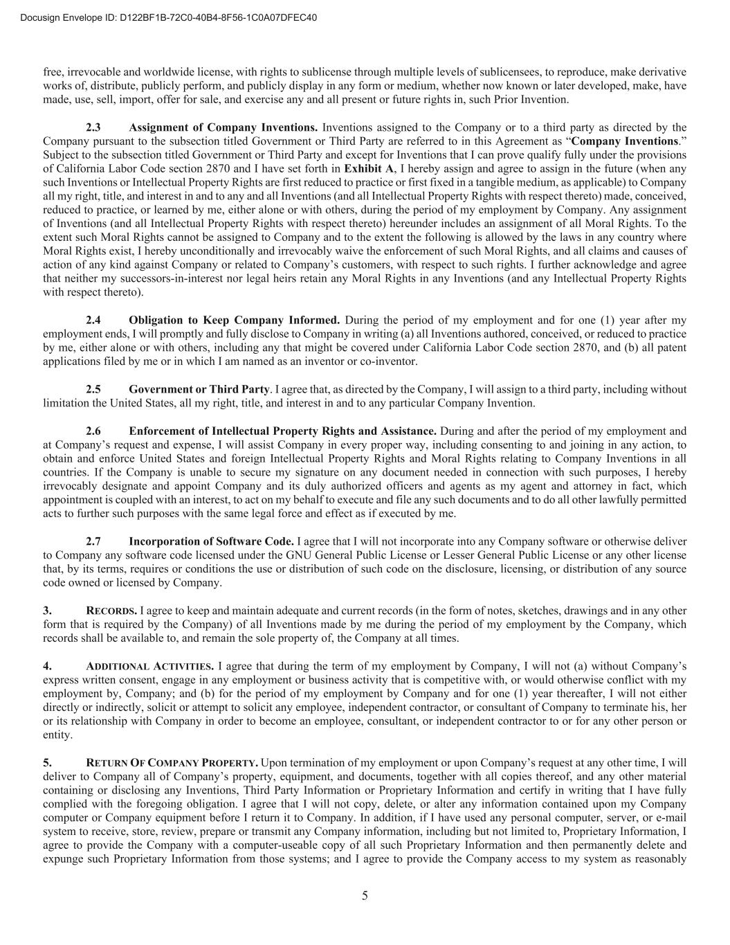 5 free, irrevocable and worldwide license, with rights to sublicense through multiple levels of sublicensees, to reproduce, make derivative works of, distribute, publicly perform, and publicly display in any form or medium, whether now known or later developed, make, have made, use, sell, import, offer for sale, and exercise any and all present or future rights in, such Prior Invention. 2.3 Assignment of Company Inventions. Inventions assigned to the Company or to a third party as directed by the Company pursuant to the subsection titled Government or Third Party are referred to in this Agreement as “Company Inventions.” Subject to the subsection titled Government or Third Party and except for Inventions that I can prove qualify fully under the provisions of California Labor Code section 2870 and I have set forth in Exhibit A, I hereby assign and agree to assign in the future (when any such Inventions or Intellectual Property Rights are first reduced to practice or first fixed in a tangible medium, as applicable) to Company all my right, title, and interest in and to any and all Inventions (and all Intellectual Property Rights with respect thereto) made, conceived, reduced to practice, or learned by me, either alone or with others, during the period of my employment by Company. Any assignment of Inventions (and all Intellectual Property Rights with respect thereto) hereunder includes an assignment of all Moral Rights. To the extent such Moral Rights cannot be assigned to Company and to the extent the following is allowed by the laws in any country where Moral Rights exist, I hereby unconditionally and irrevocably waive the enforcement of such Moral Rights, and all claims and causes of action of any kind against Company or related to Company’s customers, with respect to such rights. I further acknowledge and agree that neither my successors-in-interest nor legal heirs retain any Moral Rights in any Inventions (and any Intellectual Property Rights with respect thereto). 2.4 Obligation to Keep Company Informed. During the period of my employment and for one (1) year after my employment ends, I will promptly and fully disclose to Company in writing (a) all Inventions authored, conceived, or reduced to practice by me, either alone or with others, including any that might be covered under California Labor Code section 2870, and (b) all patent applications filed by me or in which I am named as an inventor or co-inventor. 2.5 Government or Third Party. I agree that, as directed by the Company, I will assign to a third party, including without limitation the United States, all my right, title, and interest in and to any particular Company Invention. 2.6 Enforcement of Intellectual Property Rights and Assistance. During and after the period of my employment and at Company’s request and expense, I will assist Company in every proper way, including consenting to and joining in any action, to obtain and enforce United States and foreign Intellectual Property Rights and Moral Rights relating to Company Inventions in all countries. If the Company is unable to secure my signature on any document needed in connection with such purposes, I hereby irrevocably designate and appoint Company and its duly authorized officers and agents as my agent and attorney in fact, which appointment is coupled with an interest, to act on my behalf to execute and file any such documents and to do all other lawfully permitted acts to further such purposes with the same legal force and effect as if executed by me. 2.7 Incorporation of Software Code. I agree that I will not incorporate into any Company software or otherwise deliver to Company any software code licensed under the GNU General Public License or Lesser General Public License or any other license that, by its terms, requires or conditions the use or distribution of such code on the disclosure, licensing, or distribution of any source code owned or licensed by Company. 3. RECORDS. I agree to keep and maintain adequate and current records (in the form of notes, sketches, drawings and in any other form that is required by the Company) of all Inventions made by me during the period of my employment by the Company, which records shall be available to, and remain the sole property of, the Company at all times. 4. ADDITIONAL ACTIVITIES. I agree that during the term of my employment by Company, I will not (a) without Company’s express written consent, engage in any employment or business activity that is competitive with, or would otherwise conflict with my employment by, Company; and (b) for the period of my employment by Company and for one (1) year thereafter, I will not either directly or indirectly, solicit or attempt to solicit any employee, independent contractor, or consultant of Company to terminate his, her or its relationship with Company in order to become an employee, consultant, or independent contractor to or for any other person or entity. 5. RETURN OF COMPANY PROPERTY. Upon termination of my employment or upon Company’s request at any other time, I will deliver to Company all of Company’s property, equipment, and documents, together with all copies thereof, and any other material containing or disclosing any Inventions, Third Party Information or Proprietary Information and certify in writing that I have fully complied with the foregoing obligation. I agree that I will not copy, delete, or alter any information contained upon my Company computer or Company equipment before I return it to Company. In addition, if I have used any personal computer, server, or e-mail system to receive, store, review, prepare or transmit any Company information, including but not limited to, Proprietary Information, I agree to provide the Company with a computer-useable copy of all such Proprietary Information and then permanently delete and expunge such Proprietary Information from those systems; and I agree to provide the Company access to my system as reasonab