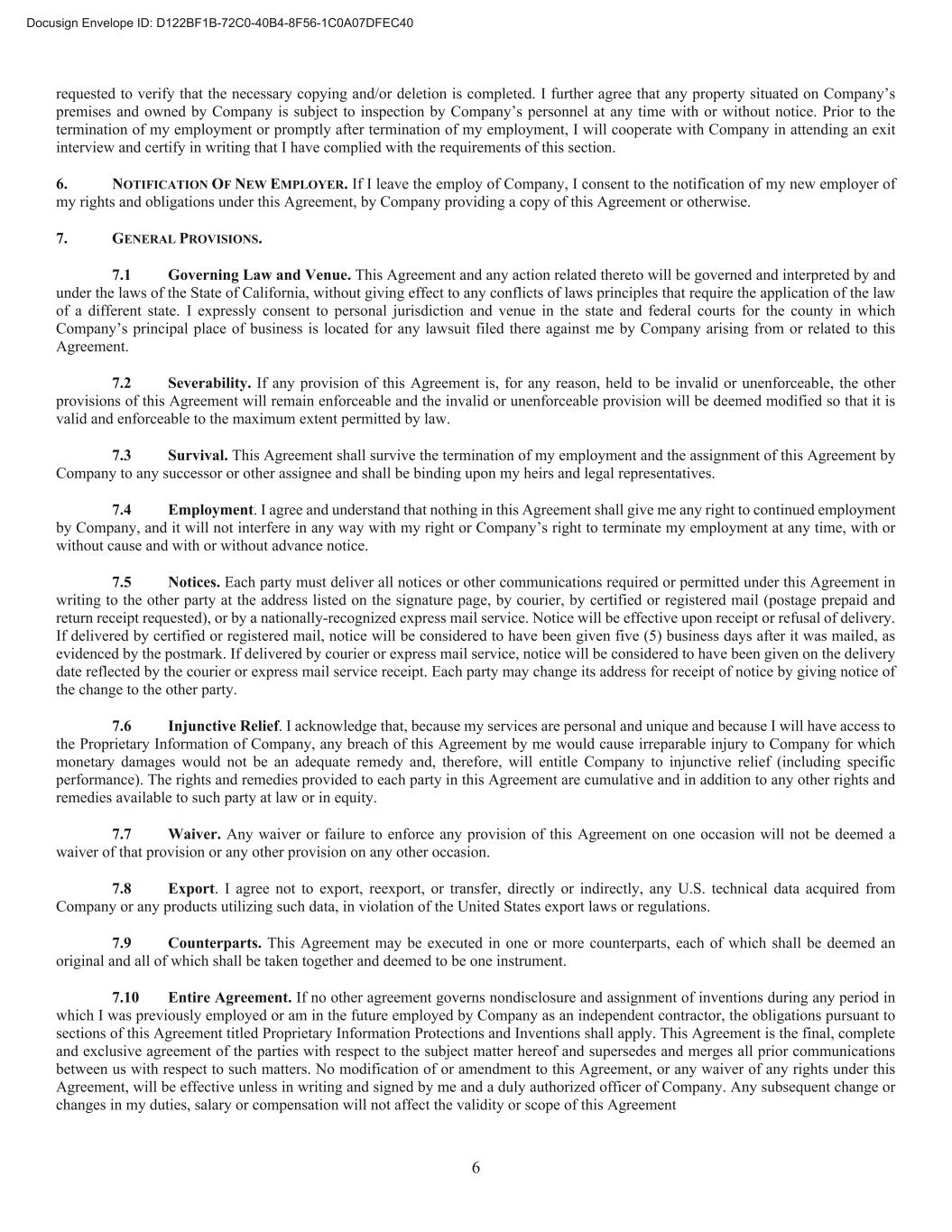 6 requested to verify that the necessary copying and/or deletion is completed. I further agree that any property situated on Company’s premises and owned by Company is subject to inspection by Company’s personnel at any time with or without notice. Prior to the termination of my employment or promptly after termination of my employment, I will cooperate with Company in attending an exit interview and certify in writing that I have complied with the requirements of this section. 6. NOTIFICATION OF NEW EMPLOYER. If I leave the employ of Company, I consent to the notification of my new employer of my rights and obligations under this Agreement, by Company providing a copy of this Agreement or otherwise. 7. GENERAL PROVISIONS. 7.1 Governing Law and Venue. This Agreement and any action related thereto will be governed and interpreted by and under the laws of the State of California, without giving effect to any conflicts of laws principles that require the application of the law of a different state. I expressly consent to personal jurisdiction and venue in the state and federal courts for the county in which Company’s principal place of business is located for any lawsuit filed there against me by Company arising from or related to this Agreement. 7.2 Severability. If any provision of this Agreement is, for any reason, held to be invalid or unenforceable, the other provisions of this Agreement will remain enforceable and the invalid or unenforceable provision will be deemed modified so that it is valid and enforceable to the maximum extent permitted by law. 7.3 Survival. This Agreement shall survive the termination of my employment and the assignment of this Agreement by Company to any successor or other assignee and shall be binding upon my heirs and legal representatives. 7.4 Employment. I agree and understand that nothing in this Agreement shall give me any right to continued employment by Company, and it will not interfere in any way with my right or Company’s right to terminate my employment at any time, with or without cause and with or without advance notice. 7.5 Notices. Each party must deliver all notices or other communications required or permitted under this Agreement in writing to the other party at the address listed on the signature page, by courier, by certified or registered mail (postage prepaid and return receipt requested), or by a nationally-recognized express mail service. Notice will be effective upon receipt or refusal of delivery. If delivered by certified or registered mail, notice will be considered to have been given five (5) business days after it was mailed, as evidenced by the postmark. If delivered by courier or express mail service, notice will be considered to have been given on the delivery date reflected by the courier or express mail service receipt. Each party may change its address for receipt of notice by giving notice of the change to the other party. 7.6 Injunctive Relief. I acknowledge that, because my services are personal and unique and because I will have access to the Proprietary Information of Company, any breach of this Agreement by me would cause irreparable injury to Company for which monetary damages would not be an adequate remedy and, therefore, will entitle Company to injunctive relief (including specific performance). The rights and remedies provided to each party in this Agreement are cumulative and in addition to any other rights and remedies available to such party at law or in equity. 7.7 Waiver. Any waiver or failure to enforce any provision of this Agreement on one occasion will not be deemed a waiver of that provision or any other provision on any other occasion. 7.8 Export. I agree not to export, reexport, or transfer, directly or indirectly, any U.S. technical data acquired from Company or any products utilizing such data, in violation of the United States export laws or regulations. 7.9 Counterparts. This Agreement may be executed in one or more counterparts, each of which shall be deemed an original and all of which shall be taken together and deemed to be one instrument. 7.10 Entire Agreement. If no other agreement governs nondisclosure and assignment of inventions during any period in which I was previously employed or am in the future employed by Company as an independent contractor, the obligations pursuant to sections of this Agreement titled Proprietary Information Protections and Inventions shall apply. This Agreement is the final, complete and exclusive agreement of the parties with respect to the subject matter hereof and supersedes and merges all prior communications between us with respect to such matters. No modification of or amendment to this Agreement, or any waiver of any rights under this Agreement, will be effective unless in writing and signed by me and a duly authorized officer of Company. Any subsequent change or changes in my duties, salary or compensation will not affect the validity or scope of this Agreement