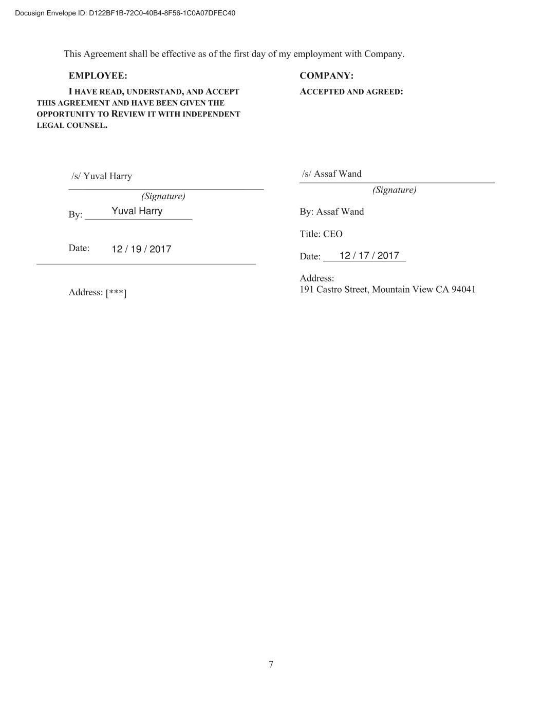 7 This Agreement shall be effective as of the first day of my employment with Company. EMPLOYEE: I HAVE READ, UNDERSTAND, AND ACCEPT THIS AGREEMENT AND HAVE BEEN GIVEN THE OPPORTUNITY TO REVIEW IT WITH INDEPENDENT LEGAL COUNSEL. (Signature) By: ______________________ Date: _____________________________________________ COMPANY: ACCEPTED AND AGREED: (Signature) By: Assaf Wand Title: CEO Date: _________________ Address: 191 Castro Street, Mountain View CA 94041 12 / 17 / 2017 Yuval Harry 12 / 19 / 2017 Address: [***] /s/ Yuval Harry /s/ Assaf Wand