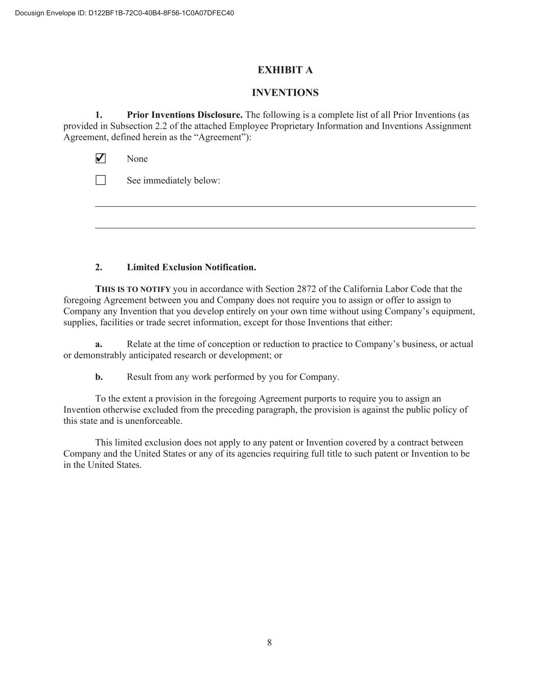 8 EXHIBIT A INVENTIONS 1. Prior Inventions Disclosure. The following is a complete list of all Prior Inventions (as provided in Subsection 2.2 of the attached Employee Proprietary Information and Inventions Assignment Agreement, defined herein as the “Agreement”): None See immediately below: 2. Limited Exclusion Notification. THIS IS TO NOTIFY you in accordance with Section 2872 of the California Labor Code that the foregoing Agreement between you and Company does not require you to assign or offer to assign to Company any Invention that you develop entirely on your own time without using Company’s equipment, supplies, facilities or trade secret information, except for those Inventions that either: a. Relate at the time of conception or reduction to practice to Company’s business, or actual or demonstrably anticipated research or development; or b. Result from any work performed by you for Company. To the extent a provision in the foregoing Agreement purports to require you to assign an Invention otherwise excluded from the preceding paragraph, the provision is against the public policy of this state and is unenforceable. This limited exclusion does not apply to any patent or Invention covered by a contract between Company and the United States or any of its agencies requiring full title to such patent or Invention to be in the United States.