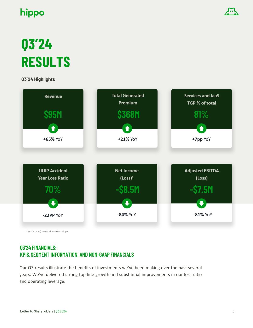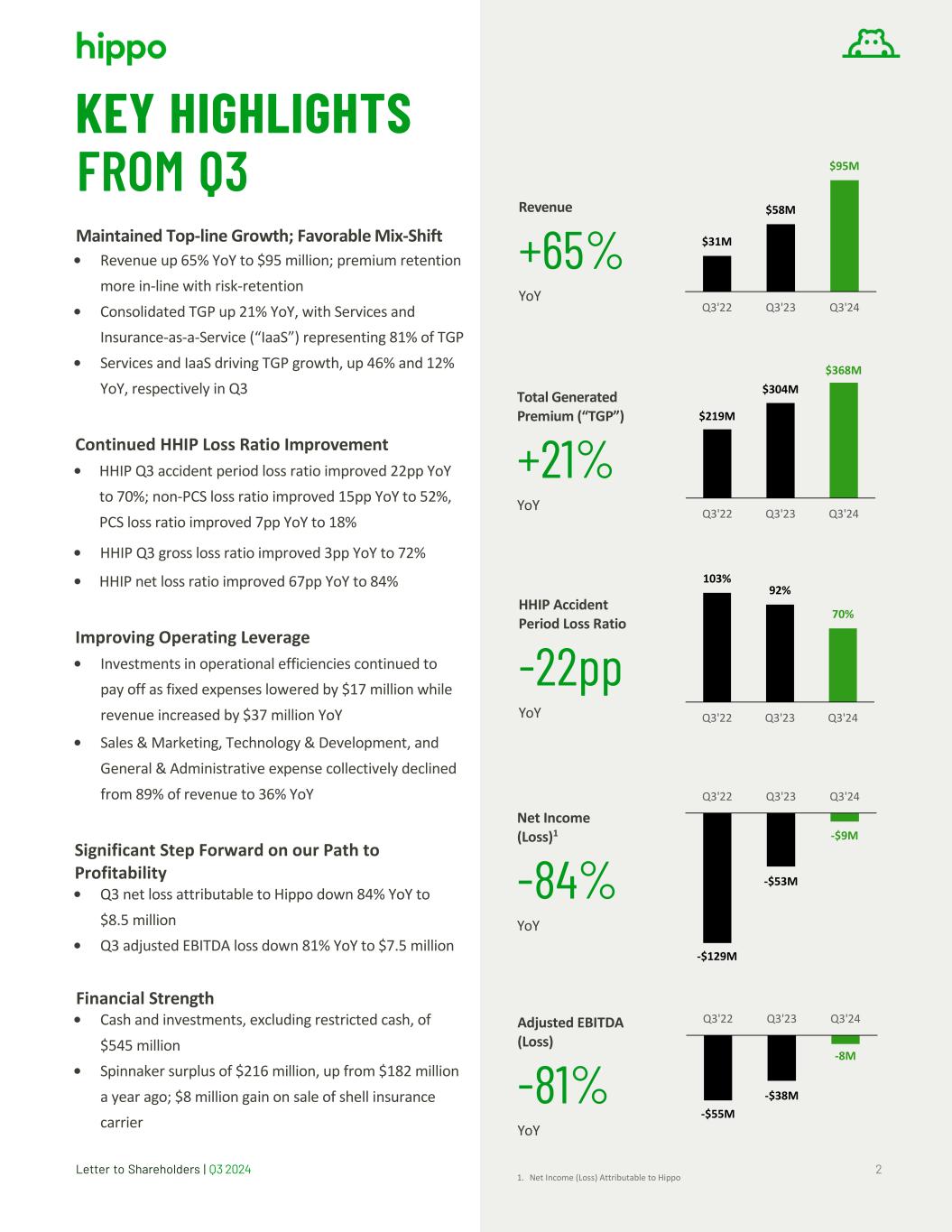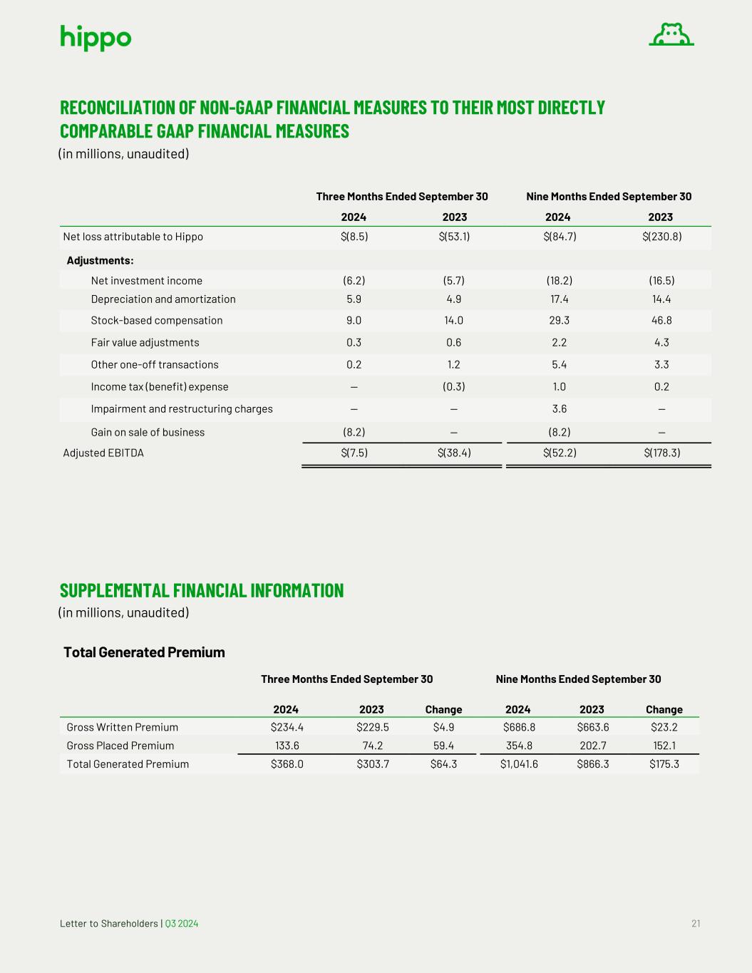 Letter to Shareholders | Q3 2024 21 RECONCILIATION OF NON-GAAP FINANCIAL MEASURES TO THEIR MOST DIRECTLY COMPARABLE GAAP FINANCIAL MEASURES (in millions, unaudited) Three Months Ended September 30 Nine Months Ended September 30 2024 2023 2024 2023 Net loss attributable to Hippo $(8.5) $(53.1) $(84.7) $(230.8) Adjustments: Net investment income (6.2) (5.7) (18.2) (16.5) Depreciation and amortization 5.9 4.9 17.4 14.4 Stock-based compensation 9.0 14.0 29.3 46.8 Fair value adjustments 0.3 0.6 2.2 4.3 Other one-off transactions 0.2 1.2 5.4 3.3 Income tax (benefit) expense — (0.3) 1.0 0.2 Impairment and restructuring charges — — 3.6 — Gain on sale of business (8.2) — (8.2) — Adjusted EBITDA $(7.5) $(38.4) $(52.2) $(178.3) SUPPLEMENTAL FINANCIAL INFORMATION (in millions, unaudited) Total Generated Premium Three Months Ended September 30 Nine Months Ended September 30 2024 2023 Change 2024 2023 Change Gross Written Premium $234.4 $229.5 $4.9 $686.8 $663.6 $23.2 Gross Placed Premium 133.6 74.2 59.4 354.8 202.7 152.1 Total Generated Premium $368.0 $303.7 $64.3 $1,041.6 $866.3 $175.3