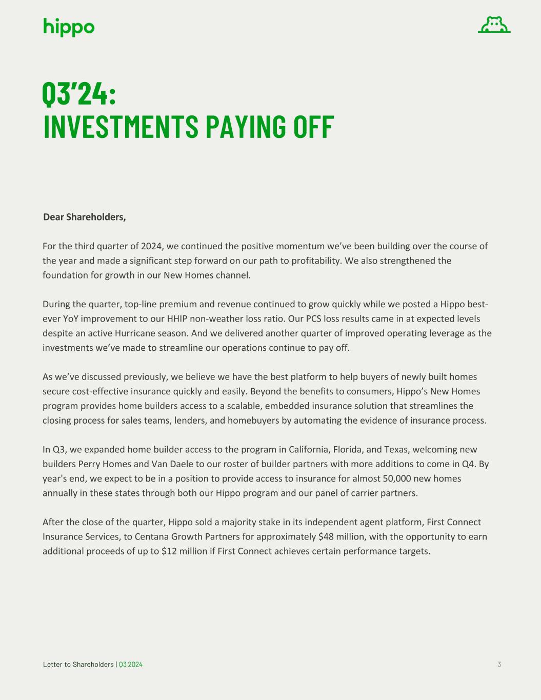 Letter to Shareholders | Q3 2024 3 Q3’24: INVESTMENTS PAYING OFF Dear Shareholders, For the third quarter of 2024, we continued the positive momentum we’ve been building over the course of the year and made a significant step forward on our path to profitability. We also strengthened the foundation for growth in our New Homes channel. During the quarter, top-line premium and revenue continued to grow quickly while we posted a Hippo best- ever YoY improvement to our HHIP non-weather loss ratio. Our PCS loss results came in at expected levels despite an active Hurricane season. And we delivered another quarter of improved operating leverage as the investments we’ve made to streamline our operations continue to pay off. As we’ve discussed previously, we believe we have the best platform to help buyers of newly built homes secure cost-effective insurance quickly and easily. Beyond the benefits to consumers, Hippo’s New Homes program provides home builders access to a scalable, embedded insurance solution that streamlines the closing process for sales teams, lenders, and homebuyers by automating the evidence of insurance process. In Q3, we expanded home builder access to the program in California, Florida, and Texas, welcoming new builders Perry Homes and Van Daele to our roster of builder partners with more additions to come in Q4. By year's end, we expect to be in a position to provide access to insurance for almost 50,000 new homes annually in these states through both our Hippo program and our panel of carrier partners. After the close of the quarter, Hippo sold a majority stake in its independent agent platform, First Connect Insurance Services, to Centana Growth Partners for approximately $48 million, with the opportunity to earn additional proceeds of up to $12 million if First Connect achieves certain performance targets.