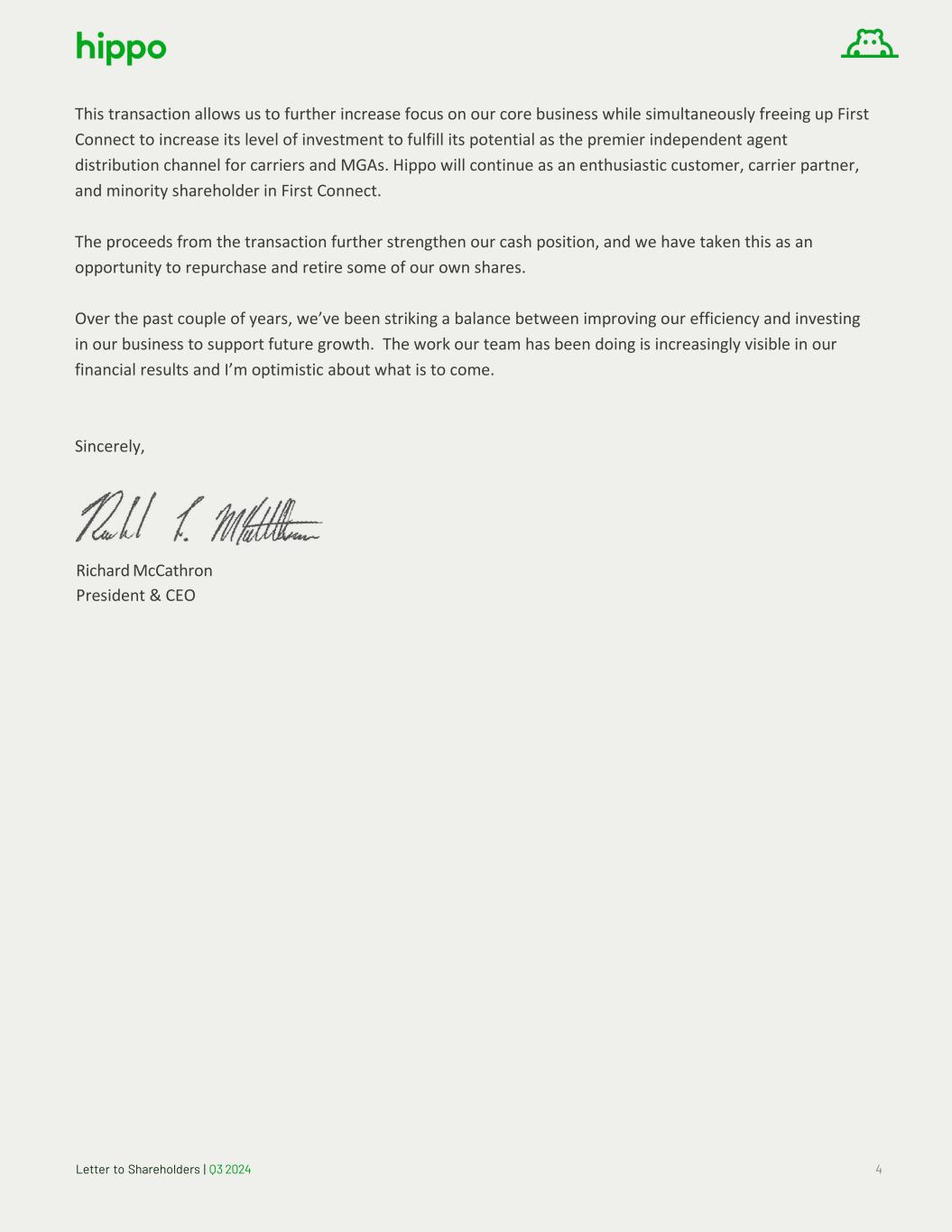 Letter to Shareholders | Q3 2024 4 This transaction allows us to further increase focus on our core business while simultaneously freeing up First Connect to increase its level of investment to fulfill its potential as the premier independent agent distribution channel for carriers and MGAs. Hippo will continue as an enthusiastic customer, carrier partner, and minority shareholder in First Connect. The proceeds from the transaction further strengthen our cash position, and we have taken this as an opportunity to repurchase and retire some of our own shares. Over the past couple of years, we’ve been striking a balance between improving our efficiency and investing in our business to support future growth. The work our team has been doing is increasingly visible in our financial results and I’m optimistic about what is to come. Sincerely, Richard McCathron President & CEO