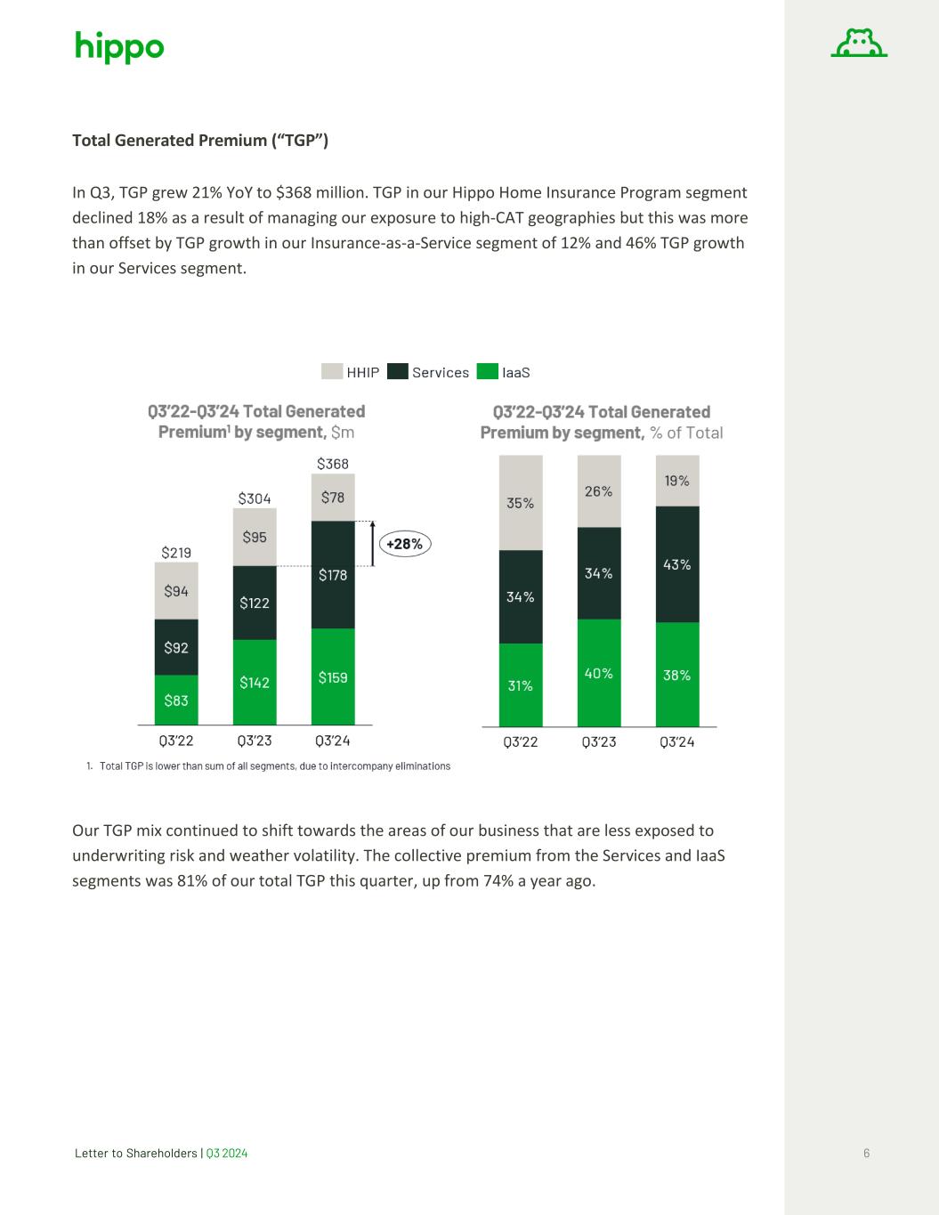Letter to Shareholders | Q3 2024 6 Total Generated Premium (“TGP”) In Q3, TGP grew 21% YoY to $368 million. TGP in our Hippo Home Insurance Program segment declined 18% as a result of managing our exposure to high-CAT geographies but this was more than offset by TGP growth in our Insurance-as-a-Service segment of 12% and 46% TGP growth in our Services segment. Our TGP mix continued to shift towards the areas of our business that are less exposed to underwriting risk and weather volatility. The collective premium from the Services and IaaS segments was 81% of our total TGP this quarter, up from 74% a year ago.
