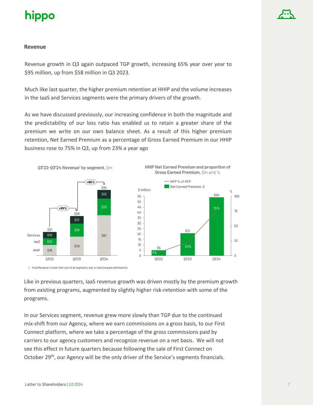 Letter to Shareholders | Q3 2024 7 Revenue Revenue growth in Q3 again outpaced TGP growth, increasing 65% year over year to $95 million, up from $58 million in Q3 2023. Much like last quarter, the higher premium retention at HHIP and the volume increases in the IaaS and Services segments were the primary drivers of the growth. As we have discussed previously, our increasing confidence in both the magnitude and the predictability of our loss ratio has enabled us to retain a greater share of the premium we write on our own balance sheet. As a result of this higher premium retention, Net Earned Premium as a percentage of Gross Earned Premium in our HHIP business rose to 75% in Q3, up from 23% a year ago Like in previous quarters, IaaS revenue growth was driven mostly by the premium growth from existing programs, augmented by slightly higher risk-retention with some of the programs. In our Services segment, revenue grew more slowly than TGP due to the continued mix-shift from our Agency, where we earn commissions on a gross basis, to our First Connect platform, where we take a percentage of the gross commissions paid by carriers to our agency customers and recognize revenue on a net basis. We will not see this effect in future quarters because following the sale of First Connect on October 29th, our Agency will be the only driver of the Service’s segments financials.