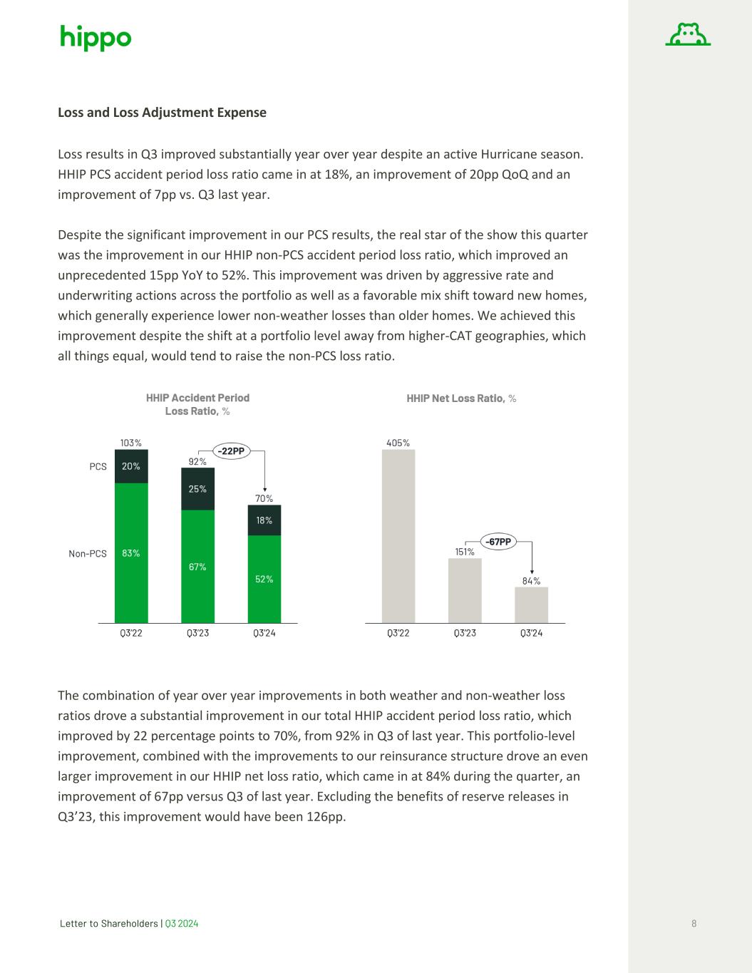 Letter to Shareholders | Q3 2024 8 Loss and Loss Adjustment Expense Loss results in Q3 improved substantially year over year despite an active Hurricane season. HHIP PCS accident period loss ratio came in at 18%, an improvement of 20pp QoQ and an improvement of 7pp vs. Q3 last year. Despite the significant improvement in our PCS results, the real star of the show this quarter was the improvement in our HHIP non-PCS accident period loss ratio, which improved an unprecedented 15pp YoY to 52%. This improvement was driven by aggressive rate and underwriting actions across the portfolio as well as a favorable mix shift toward new homes, which generally experience lower non-weather losses than older homes. We achieved this improvement despite the shift at a portfolio level away from higher-CAT geographies, which all things equal, would tend to raise the non-PCS loss ratio. The combination of year over year improvements in both weather and non-weather loss ratios drove a substantial improvement in our total HHIP accident period loss ratio, which improved by 22 percentage points to 70%, from 92% in Q3 of last year. This portfolio-level improvement, combined with the improvements to our reinsurance structure drove an even larger improvement in our HHIP net loss ratio, which came in at 84% during the quarter, an improvement of 67pp versus Q3 of last year. Excluding the benefits of reserve releases in Q3’23, this improvement would have been 126pp.