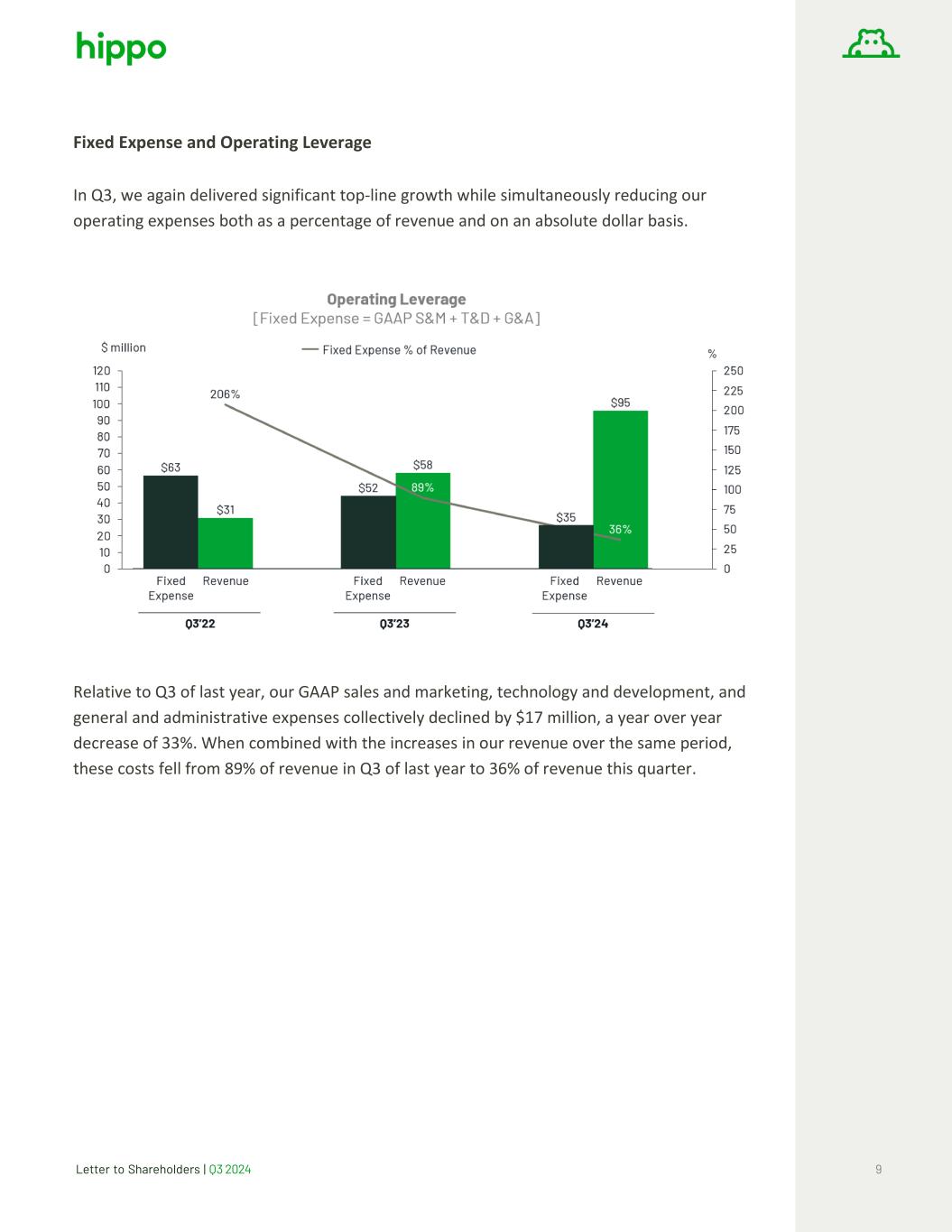 Letter to Shareholders | Q3 2024 9 Fixed Expense and Operating Leverage In Q3, we again delivered significant top-line growth while simultaneously reducing our operating expenses both as a percentage of revenue and on an absolute dollar basis. Relative to Q3 of last year, our GAAP sales and marketing, technology and development, and general and administrative expenses collectively declined by $17 million, a year over year decrease of 33%. When combined with the increases in our revenue over the same period, these costs fell from 89% of revenue in Q3 of last year to 36% of revenue this quarter.