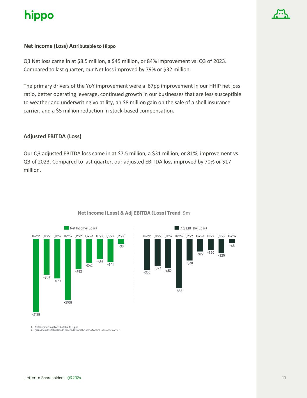 Letter to Shareholders | Q3 2024 10 Net Income (Loss) Attributable to Hippo Q3 Net loss came in at $8.5 million, a $45 million, or 84% improvement vs. Q3 of 2023. Compared to last quarter, our Net loss improved by 79% or $32 million. The primary drivers of the YoY improvement were a 67pp improvement in our HHIP net loss ratio, better operating leverage, continued growth in our businesses that are less susceptible to weather and underwriting volatility, an $8 million gain on the sale of a shell insurance carrier, and a $5 million reduction in stock-based compensation. Adjusted EBITDA (Loss) Our Q3 adjusted EBITDA loss came in at $7.5 million, a $31 million, or 81%, improvement vs. Q3 of 2023. Compared to last quarter, our adjusted EBITDA loss improved by 70% or $17 million.