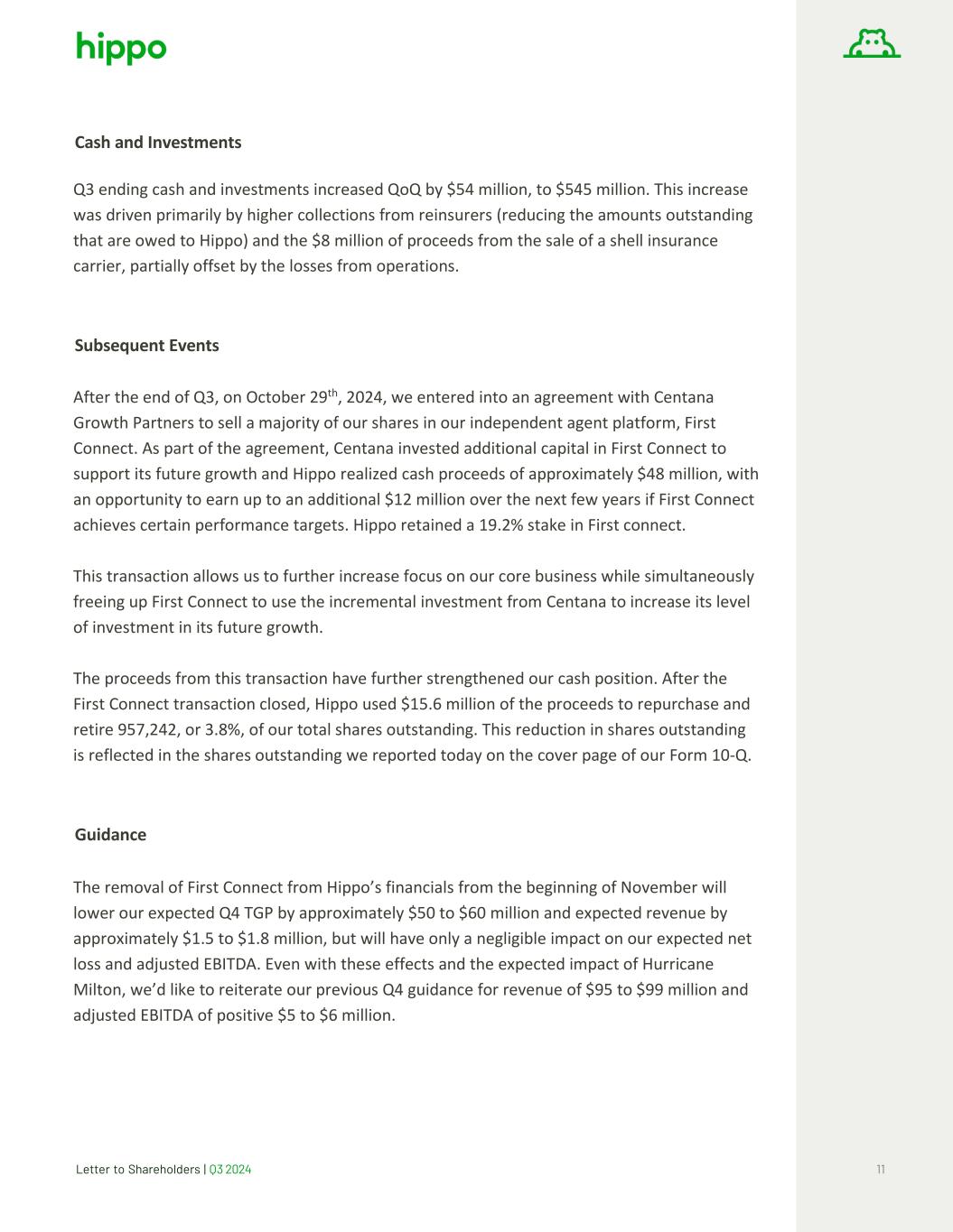 Letter to Shareholders | Q3 2024 11 Cash and Investments Q3 ending cash and investments increased QoQ by $54 million, to $545 million. This increase was driven primarily by higher collections from reinsurers (reducing the amounts outstanding that are owed to Hippo) and the $8 million of proceeds from the sale of a shell insurance carrier, partially offset by the losses from operations. Subsequent Events After the end of Q3, on October 29th, 2024, we entered into an agreement with Centana Growth Partners to sell a majority of our shares in our independent agent platform, First Connect. As part of the agreement, Centana invested additional capital in First Connect to support its future growth and Hippo realized cash proceeds of approximately $48 million, with an opportunity to earn up to an additional $12 million over the next few years if First Connect achieves certain performance targets. Hippo retained a 19.2% stake in First connect. This transaction allows us to further increase focus on our core business while simultaneously freeing up First Connect to use the incremental investment from Centana to increase its level of investment in its future growth. The proceeds from this transaction have further strengthened our cash position. After the First Connect transaction closed, Hippo used $15.6 million of the proceeds to repurchase and retire 957,242, or 3.8%, of our total shares outstanding. This reduction in shares outstanding is reflected in the shares outstanding we reported today on the cover page of our Form 10-Q. Guidance The removal of First Connect from Hippo’s financials from the beginning of November will lower our expected Q4 TGP by approximately $50 to $60 million and expected revenue by approximately $1.5 to $1.8 million, but will have only a negligible impact on our expected net loss and adjusted EBITDA. Even with these effects and the expected impact of Hurricane Milton, we’d like to reiterate our previous Q4 guidance for revenue of $95 to $99 million and adjusted EBITDA of positive $5 to $6 million.