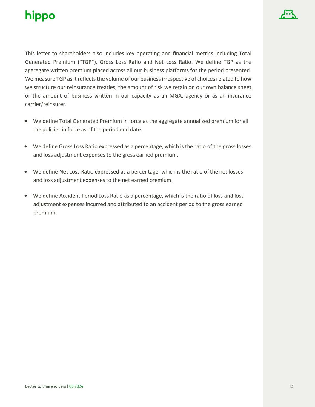 Letter to Shareholders | Q3 2024 13 This letter to shareholders also includes key operating and financial metrics including Total Generated Premium (“TGP”), Gross Loss Ratio and Net Loss Ratio. We define TGP as the aggregate written premium placed across all our business platforms for the period presented. We measure TGP as it reflects the volume of our business irrespective of choices related to how we structure our reinsurance treaties, the amount of risk we retain on our own balance sheet or the amount of business written in our capacity as an MGA, agency or as an insurance carrier/reinsurer. • We define Total Generated Premium in force as the aggregate annualized premium for all the policies in force as of the period end date. • We define Gross Loss Ratio expressed as a percentage, which is the ratio of the gross losses and loss adjustment expenses to the gross earned premium. • We define Net Loss Ratio expressed as a percentage, which is the ratio of the net losses and loss adjustment expenses to the net earned premium. • We define Accident Period Loss Ratio as a percentage, which is the ratio of loss and loss adjustment expenses incurred and attributed to an accident period to the gross earned premium.