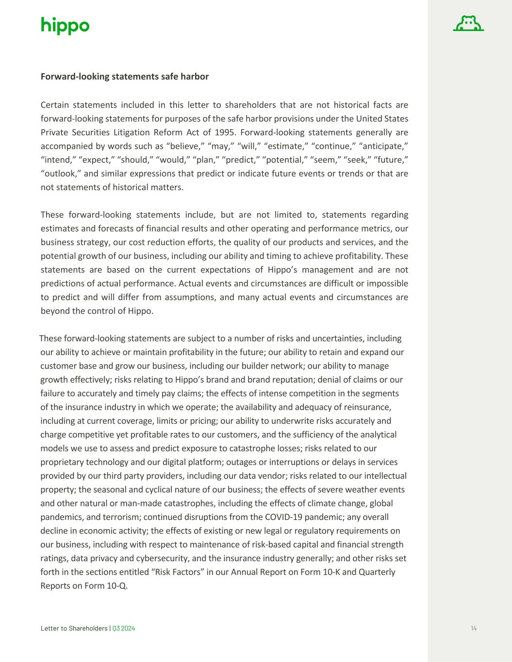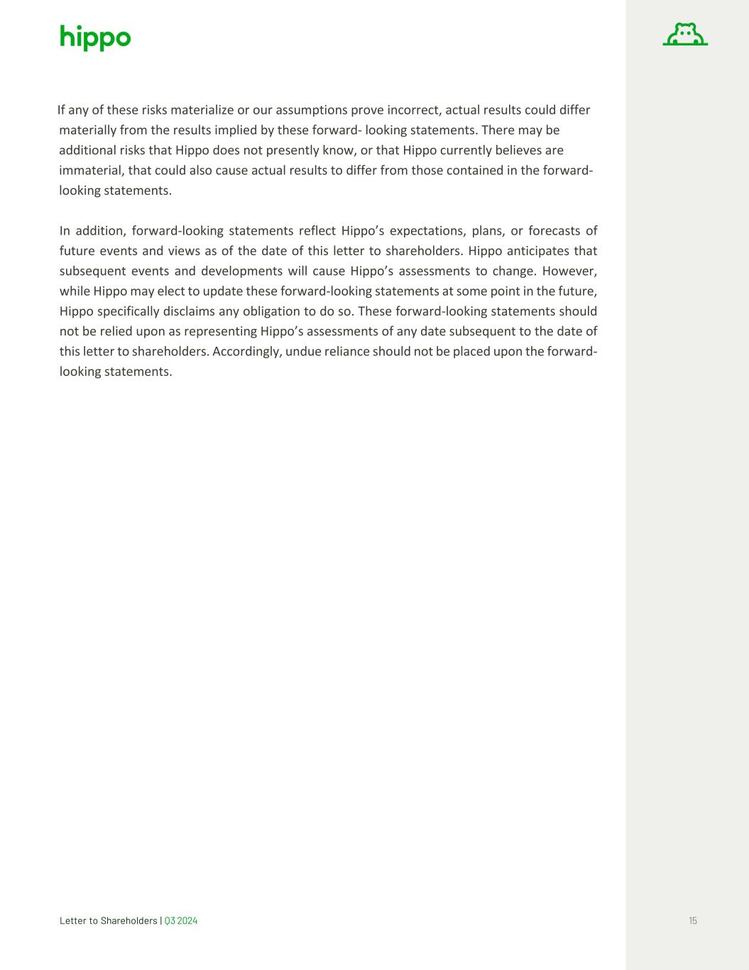 Letter to Shareholders | Q3 2024 15 If any of these risks materialize or our assumptions prove incorrect, actual results could differ materially from the results implied by these forward- looking statements. There may be additional risks that Hippo does not presently know, or that Hippo currently believes are immaterial, that could also cause actual results to differ from those contained in the forward- looking statements. In addition, forward-looking statements reflect Hippo’s expectations, plans, or forecasts of future events and views as of the date of this letter to shareholders. Hippo anticipates that subsequent events and developments will cause Hippo’s assessments to change. However, while Hippo may elect to update these forward-looking statements at some point in the future, Hippo specifically disclaims any obligation to do so. These forward-looking statements should not be relied upon as representing Hippo’s assessments of any date subsequent to the date of this letter to shareholders. Accordingly, undue reliance should not be placed upon the forward- looking statements.