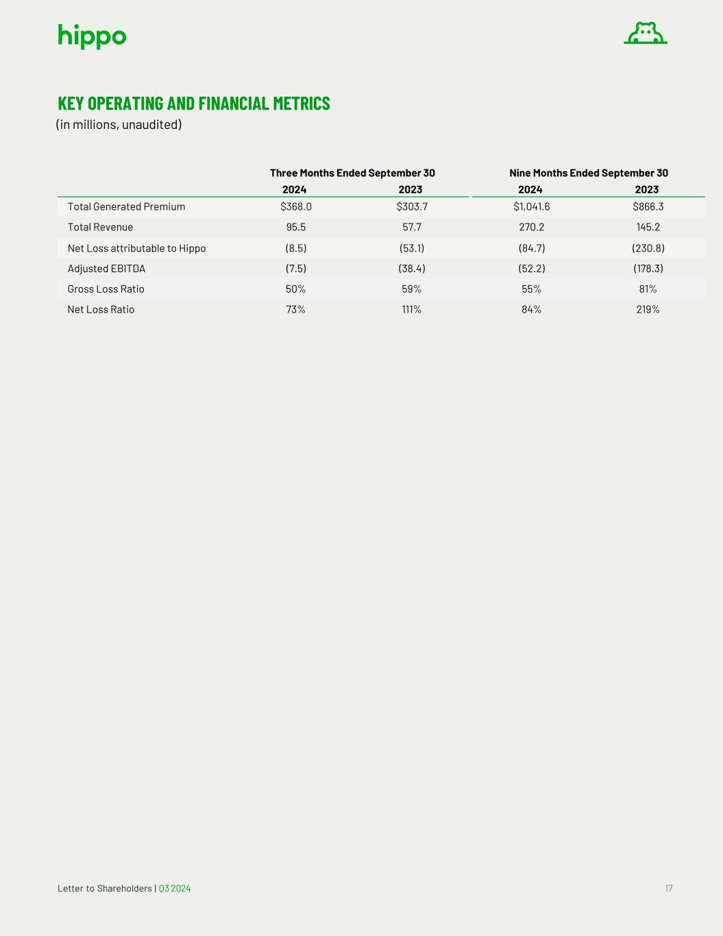 Letter to Shareholders | Q3 2024 17 KEY OPERATING AND FINANCIAL METRICS (in millions, unaudited) Three Months Ended September 30 Nine Months Ended September 30 2024 2023 2024 2023 Total Generated Premium $368.0 $303.7 $1,041.6 $866.3 Total Revenue 95.5 57.7 270.2 145.2 Net Loss attributable to Hippo (8.5) (53.1) (84.7) (230.8) Adjusted EBITDA (7.5) (38.4) (52.2) (178.3) Gross Loss Ratio 50% 59% 55% 81% Net Loss Ratio 73% 111% 84% 219%