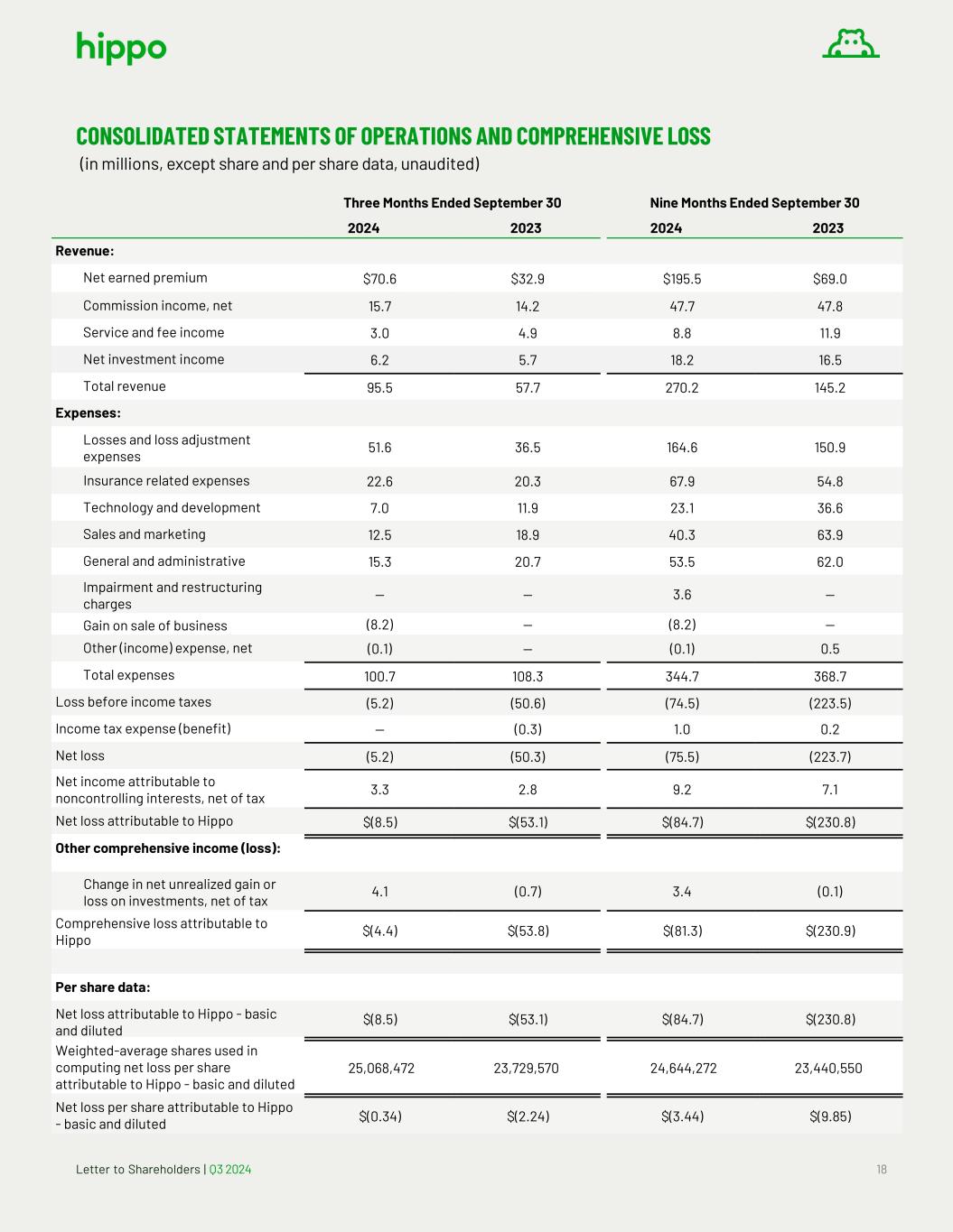 Letter to Shareholders | Q3 2024 18 CONSOLIDATED STATEMENTS OF OPERATIONS AND COMPREHENSIVE LOSS (in millions, except share and per share data, unaudited) Three Months Ended September 30 Nine Months Ended September 30 2024 2023 2024 2023 Revenue: Net earned premium $70.6 $32.9 $195.5 $69.0 Commission income, net 15.7 14.2 47.7 47.8 Service and fee income 3.0 4.9 8.8 11.9 Net investment income 6.2 5.7 18.2 16.5 Total revenue 95.5 57.7 270.2 145.2 Expenses: Losses and loss adjustment expenses 51.6 36.5 164.6 150.9 Insurance related expenses 22.6 20.3 67.9 54.8 Technology and development 7.0 11.9 23.1 36.6 Sales and marketing 12.5 18.9 40.3 63.9 General and administrative 15.3 20.7 53.5 62.0 Impairment and restructuring charges — — 3.6 — Gain on sale of business (8.2) — (8.2) — Other (income) expense, net (0.1) — (0.1) 0.5 Total expenses 100.7 108.3 344.7 368.7 Loss before income taxes (5.2) (50.6) (74.5) (223.5) Income tax expense (benefit) — (0.3) 1.0 0.2 Net loss (5.2) (50.3) (75.5) (223.7) Net income attributable to noncontrolling interests, net of tax 3.3 2.8 9.2 7.1 Net loss attributable to Hippo $(8.5) $(53.1) $(84.7) $(230.8) Other comprehensive income (loss): Change in net unrealized gain or loss on investments, net of tax 4.1 (0.7) 3.4 (0.1) Comprehensive loss attributable to Hippo $(4.4) $(53.8) $(81.3) $(230.9) Per share data: Net loss attributable to Hippo - basic and diluted $(8.5) $(53.1) $(84.7) $(230.8) Weighted-average shares used in computing net loss per share attributable to Hippo - basic and diluted 25,068,472 23,729,570 24,644,272 23,440,550 Net loss per share attributable to Hippo - basic and diluted $(0.34) $(2.24) $(3.44) $(9.85)