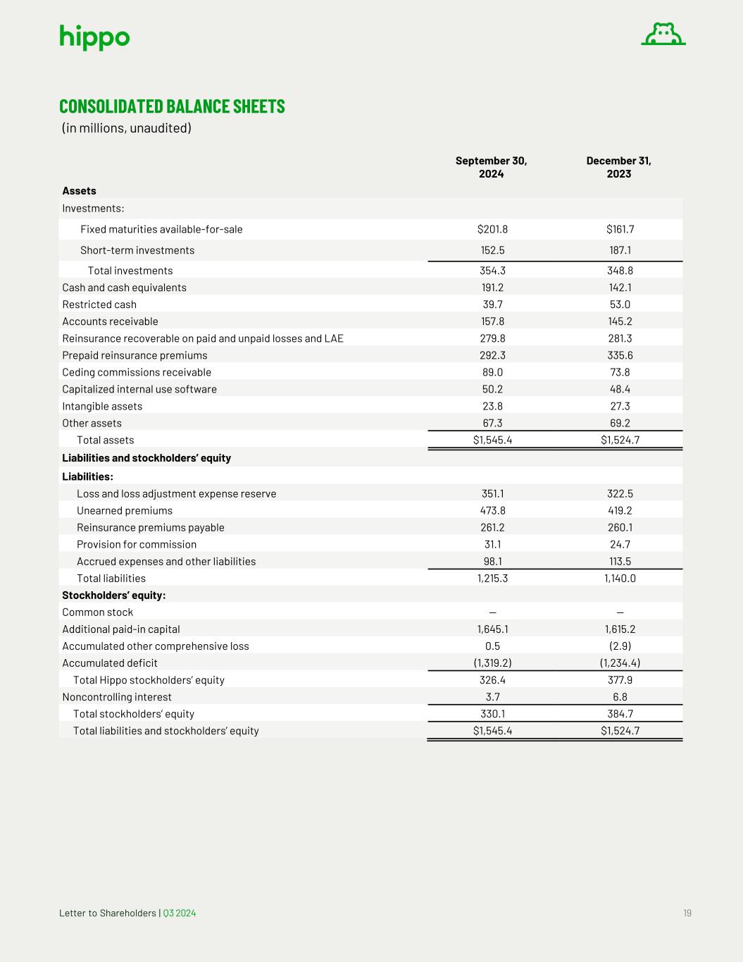 Letter to Shareholders | Q3 2024 19 CONSOLIDATED BALANCE SHEETS (in millions, unaudited) September 30, 2024 December 31, 2023 Assets Investments: Fixed maturities available-for-sale $201.8 $161.7 Short-term investments 152.5 187.1 Total investments 354.3 348.8 Cash and cash equivalents 191.2 142.1 Restricted cash 39.7 53.0 Accounts receivable 157.8 145.2 Reinsurance recoverable on paid and unpaid losses and LAE 279.8 281.3 Prepaid reinsurance premiums 292.3 335.6 Ceding commissions receivable 89.0 73.8 Capitalized internal use software 50.2 48.4 Intangible assets 23.8 27.3 Other assets 67.3 69.2 Total assets $1,545.4 $1,524.7 Liabilities and stockholders’ equity Liabilities: Loss and loss adjustment expense reserve 351.1 322.5 Unearned premiums 473.8 419.2 Reinsurance premiums payable 261.2 260.1 Provision for commission 31.1 24.7 Accrued expenses and other liabilities 98.1 113.5 Total liabilities 1,215.3 1,140.0 Stockholders’ equity: Common stock — — Additional paid-in capital 1,645.1 1,615.2 Accumulated other comprehensive loss 0.5 (2.9) Accumulated deficit (1,319.2) (1,234.4) Total Hippo stockholders’ equity 326.4 377.9 Noncontrolling interest 3.7 6.8 Total stockholders’ equity 330.1 384.7 Total liabilities and stockholders’ equity $1,545.4 $1,524.7