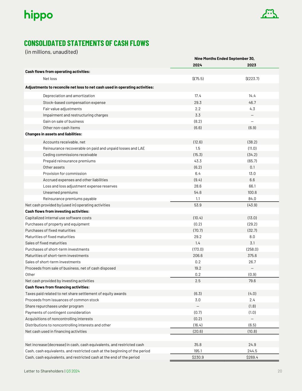 Letter to Shareholders | Q3 2024 20 CONSOLIDATED STATEMENTS OF CASH FLOWS (in millions, unaudited) Nine Months Ended September 30, 2024 2023 Cash flows from operating activities: Net loss $(75.5) $(223.7) Adjustments to reconcile net loss to net cash used in operating activities: Depreciation and amortization 17.4 14.4 Stock–based compensation expense 29.3 46.7 Fair value adjustments 2.2 4.3 Impairment and restructuring charges 3.3 — Gain on sale of business (8.2) — Other non-cash items (6.6) (6.9) Changes in assets and liabilities: Accounts receivable, net (12.6) (38.2) Reinsurance recoverable on paid and unpaid losses and LAE 1.5 (11.0) Ceding commissions receivable (15.3) (34.2) Prepaid reinsurance premiums 43.3 (65.7) Other assets (6.2) 0.1 Provision for commission 6.4 13.0 Accrued expenses and other liabilities (9.4) 6.6 Loss and loss adjustment expense reserves 28.6 66.1 Unearned premiums 54.6 100.6 Reinsurance premiums payable 1.1 84.0 Net cash provided by (used in) operating activities 53.9 (43.9) Cash flows from investing activities: Capitalized internal use software costs (10.4) (13.0) Purchases of property and equipment (0.2) (29.2) Purchases of fixed maturities (70.7) (32.7) Maturities of fixed maturities 29.2 8.0 Sales of fixed maturities 1.4 3.1 Purchases of short-term investments (173.0) (258.0) Maturities of short-term investments 206.6 375.6 Sales of short-term investments 0.2 26.7 Proceeds from sale of business, net of cash disposed 19.2 — Other 0.2 (0.9) Net cash provided by investing activities 2.5 79.6 Cash flows from financing activities: Taxes paid related to net share settlement of equity awards (6.3) (4.0) Proceeds from issuances of common stock 3.0 2.4 Share repurchases under program — (1.8) Payments of contingent consideration (0.7) (1.0) Acquisitions of noncontrolling interests (0.2) — Distributions to noncontrolling interests and other (16.4) (6.5) Net cash used in financing activities (20.6) (10.8) Net increase (decrease) in cash, cash equivalents, and restricted cash 35.8 24.9 Cash, cash equivalents, and restricted cash at the beginning of the period 195.1 244.5 Cash, cash equivalents, and restricted cash at the end of the period $230.9 $269.4