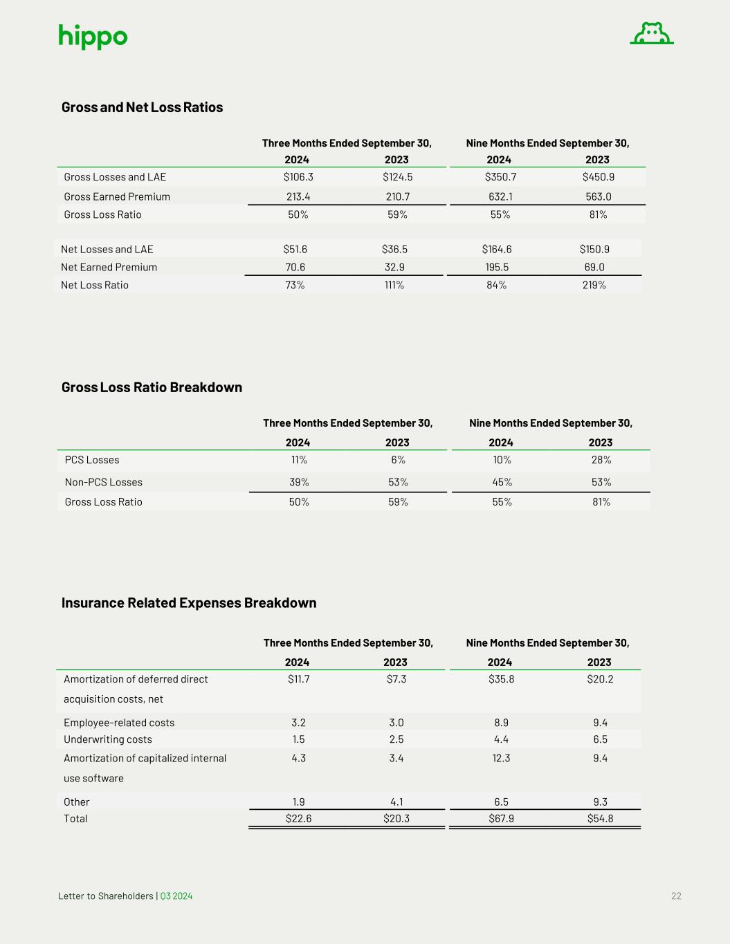 Letter to Shareholders | Q3 2024 22 Gross and Net Loss Ratios Three Months Ended September 30, Nine Months Ended September 30, 2024 2023 2024 2023 Gross Losses and LAE $106.3 $124.5 $350.7 $450.9 Gross Earned Premium 213.4 210.7 632.1 563.0 Gross Loss Ratio 50% 59% 55% 81% Net Losses and LAE $51.6 $36.5 $164.6 $150.9 Net Earned Premium 70.6 32.9 195.5 69.0 Net Loss Ratio 73% 111% 84% 219% Gross Loss Ratio Breakdown Three Months Ended September 30, Nine Months Ended September 30, 2024 2023 2024 2023 PCS Losses 11% 6% 10% 28% Non-PCS Losses 39% 53% 45% 53% Gross Loss Ratio 50% 59% 55% 81% Insurance Related Expenses Breakdown Three Months Ended September 30, Nine Months Ended September 30, 2024 2023 2024 2023 Amortization of deferred direct acquisition costs, net $11.7 $7.3 $35.8 $20.2 Employee-related costs 3.2 3.0 8.9 9.4 Underwriting costs 1.5 2.5 4.4 6.5 Amortization of capitalized internal use software 4.3 3.4 12.3 9.4 Other 1.9 4.1 6.5 9.3 Total $22.6 $20.3 $67.9 $54.8
