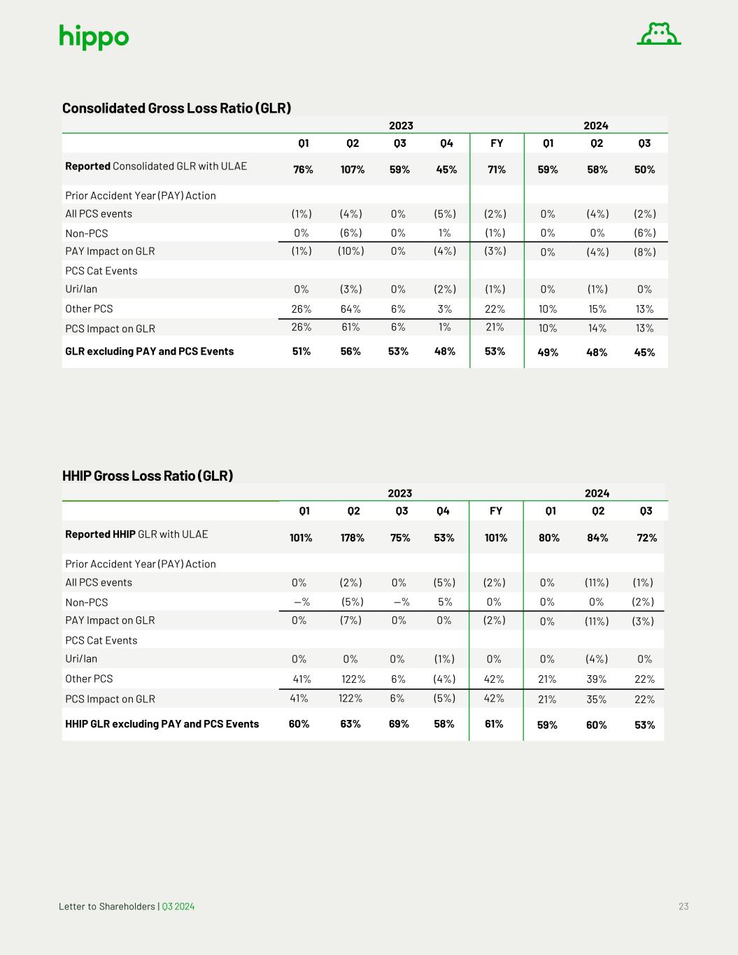 Letter to Shareholders | Q3 2024 23 Consolidated Gross Loss Ratio (GLR) 2023 2024 Q1 Q2 Q3 Q4 FY Q1 Q2 Q3 Reported Consolidated GLR with ULAE 76% 107% 59% 45% 71% 59% 58% 50% Prior Accident Year (PAY) Action All PCS events (1%) (4%) 0% (5%) (2%) 0% (4%) (2%) Non-PCS 0% (6%) 0% 1% (1%) 0% 0% (6%) PAY Impact on GLR (1%) (10%) 0% (4%) (3%) 0% (4%) (8%) PCS Cat Events Uri/Ian 0% (3%) 0% (2%) (1%) 0% (1%) 0% Other PCS 26% 64% 6% 3% 22% 10% 15% 13% PCS Impact on GLR 26% 61% 6% 1% 21% 10% 14% 13% GLR excluding PAY and PCS Events 51% 56% 53% 48% 53% 49% 48% 45% HHIP Gross Loss Ratio (GLR) 2023 2024 Q1 Q2 Q3 Q4 FY Q1 Q2 Q3 Reported HHIP GLR with ULAE 101% 178% 75% 53% 101% 80% 84% 72% Prior Accident Year (PAY) Action All PCS events 0% (2%) 0% (5%) (2%) 0% (11%) (1%) Non-PCS —% (5%) —% 5% 0% 0% 0% (2%) PAY Impact on GLR 0% (7%) 0% 0% (2%) 0% (11%) (3%) PCS Cat Events Uri/Ian 0% 0% 0% (1%) 0% 0% (4%) 0% Other PCS 41% 122% 6% (4%) 42% 21% 39% 22% PCS Impact on GLR 41% 122% 6% (5%) 42% 21% 35% 22% HHIP GLR excluding PAY and PCS Events 60% 63% 69% 58% 61% 59% 60% 53%