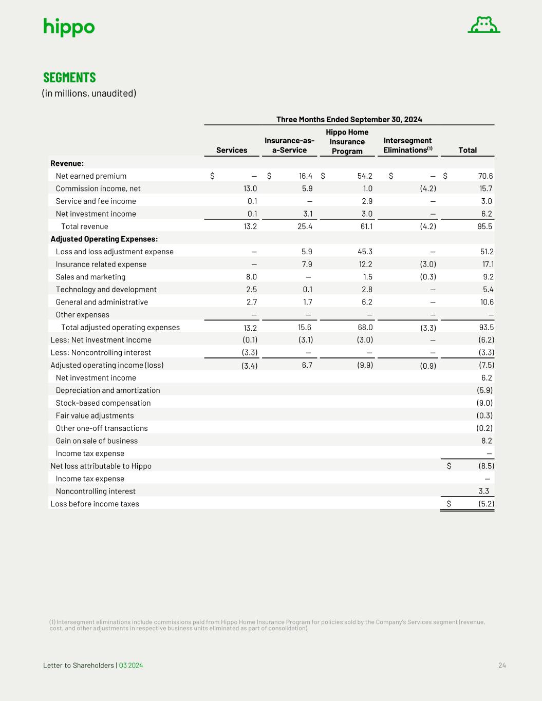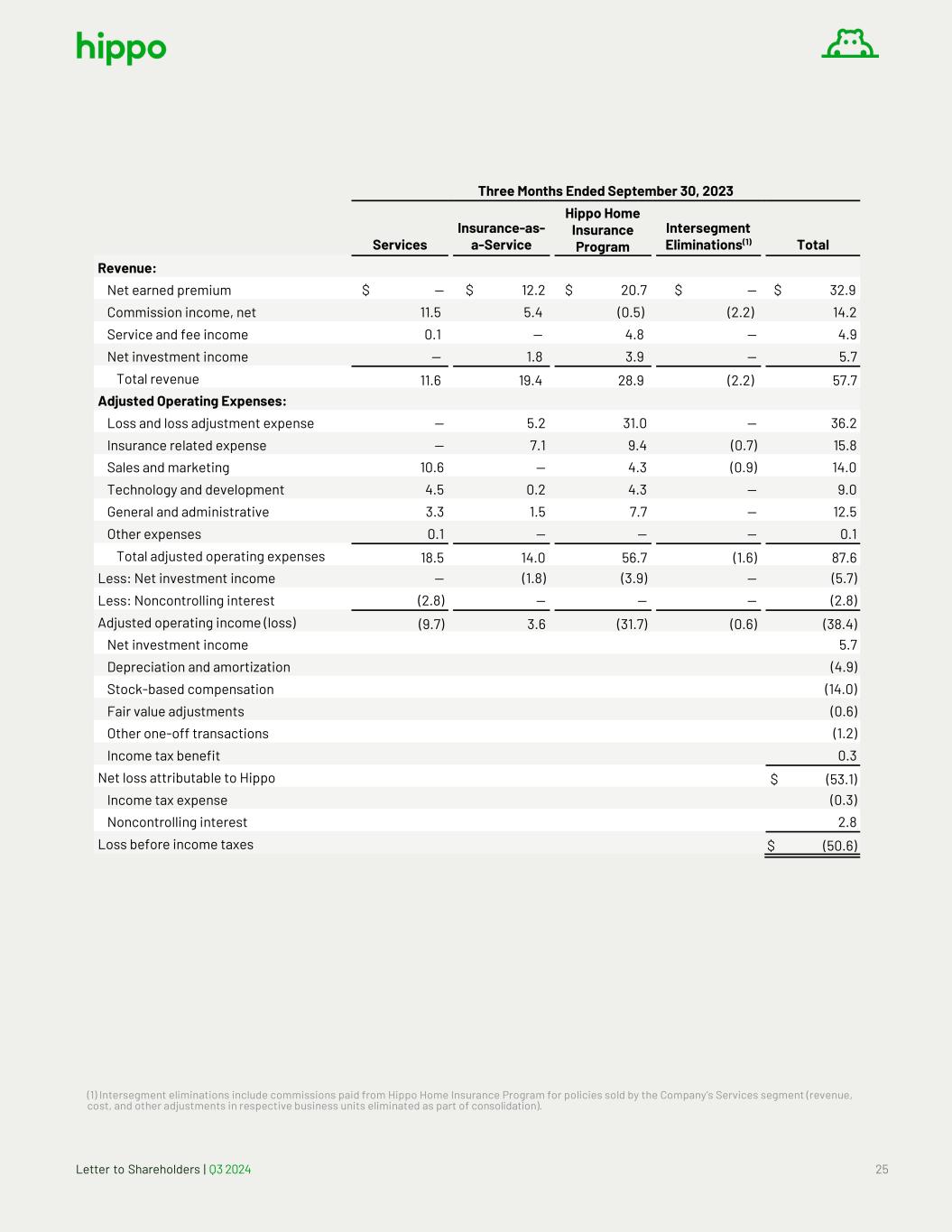 Letter to Shareholders | Q3 2024 24 SEGMENTS (in millions, unaudited) Three Months Ended September 30, 2024 Services Insurance-as- a-Service Hippo Home Insurance Program Intersegment Eliminations(1) Total Revenue: Net earned premium $ — $ 16.4 $ 54.2 $ — $ 70.6 Commission income, net 13.0 5.9 1.0 (4.2) 15.7 Service and fee income 0.1 — 2.9 — 3.0 Net investment income 0.1 3.1 3.0 — 6.2 Total revenue 13.2 25.4 61.1 (4.2) 95.5 Adjusted Operating Expenses: Loss and loss adjustment expense — 5.9 45.3 — 51.2 Insurance related expense — 7.9 12.2 (3.0) 17.1 Sales and marketing 8.0 — 1.5 (0.3) 9.2 Technology and development 2.5 0.1 2.8 — 5.4 General and administrative 2.7 1.7 6.2 — 10.6 Other expenses — — — — — Total adjusted operating expenses 13.2 15.6 68.0 (3.3) 93.5 Less: Net investment income (0.1) (3.1) (3.0) — (6.2) Less: Noncontrolling interest (3.3) — — — (3.3) Adjusted operating income (loss) (3.4) 6.7 (9.9) (0.9) (7.5) Net investment income 6.2 Depreciation and amortization (5.9) Stock-based compensation (9.0) Fair value adjustments (0.3) Other one-off transactions (0.2) Gain on sale of business 8.2 Income tax expense — Net loss attributable to Hippo $ (8.5) Income tax expense — Noncontrolling interest 3.3 Loss before income taxes $ (5.2) (1) Intersegment eliminations include commissions paid from Hippo Home Insurance Program for policies sold by the Company’s Services segment (revenue, cost, and other adjustments in respective business units eliminated as part of consolidation).