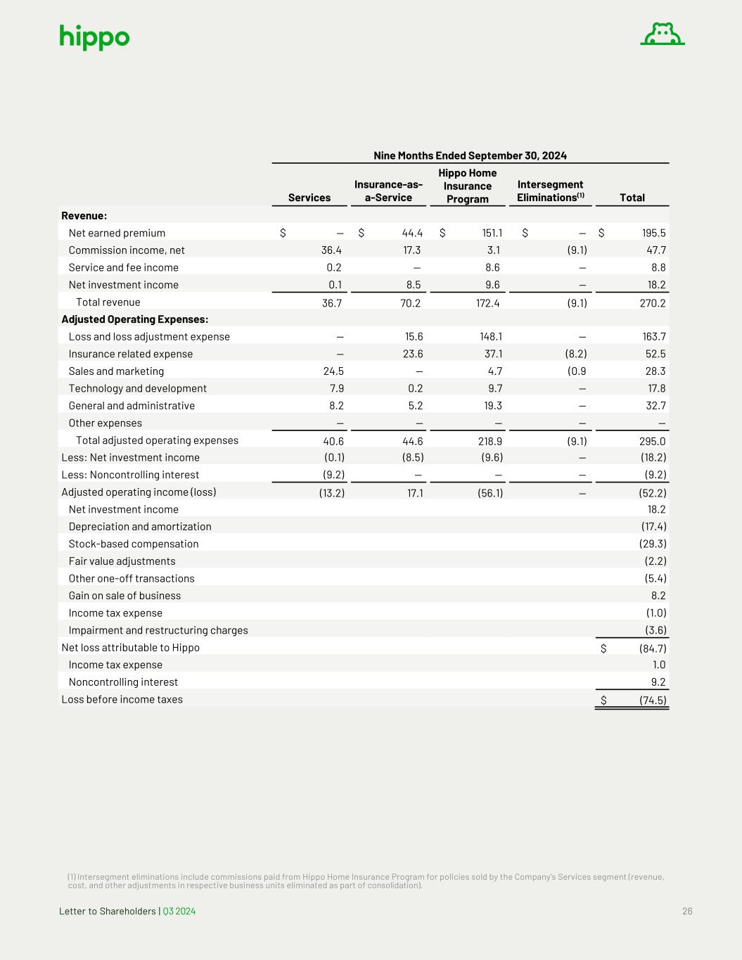 Letter to Shareholders | Q3 2024 25 Three Months Ended September 30, 2023 Services Insurance-as- a-Service Hippo Home Insurance Program Intersegment Eliminations(1) Total Revenue: Net earned premium $ — $ 12.2 $ 20.7 $ — $ 32.9 Commission income, net 11.5 5.4 (0.5) (2.2) 14.2 Service and fee income 0.1 — 4.8 — 4.9 Net investment income — 1.8 3.9 — 5.7 Total revenue 11.6 19.4 28.9 (2.2) 57.7 Adjusted Operating Expenses: Loss and loss adjustment expense — 5.2 31.0 — 36.2 Insurance related expense — 7.1 9.4 (0.7) 15.8 Sales and marketing 10.6 — 4.3 (0.9) 14.0 Technology and development 4.5 0.2 4.3 — 9.0 General and administrative 3.3 1.5 7.7 — 12.5 Other expenses 0.1 — — — 0.1 Total adjusted operating expenses 18.5 14.0 56.7 (1.6) 87.6 Less: Net investment income — (1.8) (3.9) — (5.7) Less: Noncontrolling interest (2.8) — — — (2.8) Adjusted operating income (loss) (9.7) 3.6 (31.7) (0.6) (38.4) Net investment income 5.7 Depreciation and amortization (4.9) Stock-based compensation (14.0) Fair value adjustments (0.6) Other one-off transactions (1.2) Income tax benefit 0.3 Net loss attributable to Hippo $ (53.1) Income tax expense (0.3) Noncontrolling interest 2.8 Loss before income taxes $ (50.6) (1) Intersegment eliminations include commissions paid from Hippo Home Insurance Program for policies sold by the Company’s Services segment (revenue, cost, and other adjustments in respective business units eliminated as part of consolidation).