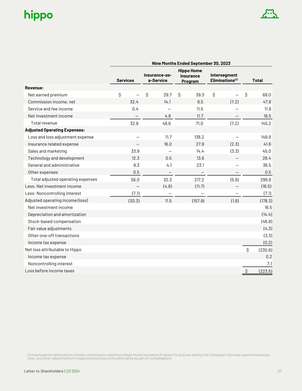 Letter to Shareholders | Q3 2024 26 Nine Months Ended September 30, 2024 Services Insurance-as- a-Service Hippo Home Insurance Program Intersegment Eliminations(1) Total Revenue: Net earned premium $ — $ 44.4 $ 151.1 $ — $ 195.5 Commission income, net 36.4 17.3 3.1 (9.1) 47.7 Service and fee income 0.2 — 8.6 — 8.8 Net investment income 0.1 8.5 9.6 — 18.2 Total revenue 36.7 70.2 172.4 (9.1) 270.2 Adjusted Operating Expenses: Loss and loss adjustment expense — 15.6 148.1 — 163.7 Insurance related expense — 23.6 37.1 (8.2) 52.5 Sales and marketing 24.5 — 4.7 (0.9 28.3 Technology and development 7.9 0.2 9.7 — 17.8 General and administrative 8.2 5.2 19.3 — 32.7 Other expenses — — — — — Total adjusted operating expenses 40.6 44.6 218.9 (9.1) 295.0 Less: Net investment income (0.1) (8.5) (9.6) — (18.2) Less: Noncontrolling interest (9.2) — — — (9.2) Adjusted operating income (loss) (13.2) 17.1 (56.1) — (52.2) Net investment income 18.2 Depreciation and amortization (17.4) Stock-based compensation (29.3) Fair value adjustments (2.2) Other one-off transactions (5.4) Gain on sale of business 8.2 Income tax expense (1.0) Impairment and restructuring charges (3.6) Net loss attributable to Hippo $ (84.7) Income tax expense 1.0 Noncontrolling interest 9.2 Loss before income taxes $ (74.5) (1) Intersegment eliminations include commissions paid from Hippo Home Insurance Program for policies sold by the Company’s Services segment (revenue, cost, and other adjustments in respective business units eliminated as part of consolidation).