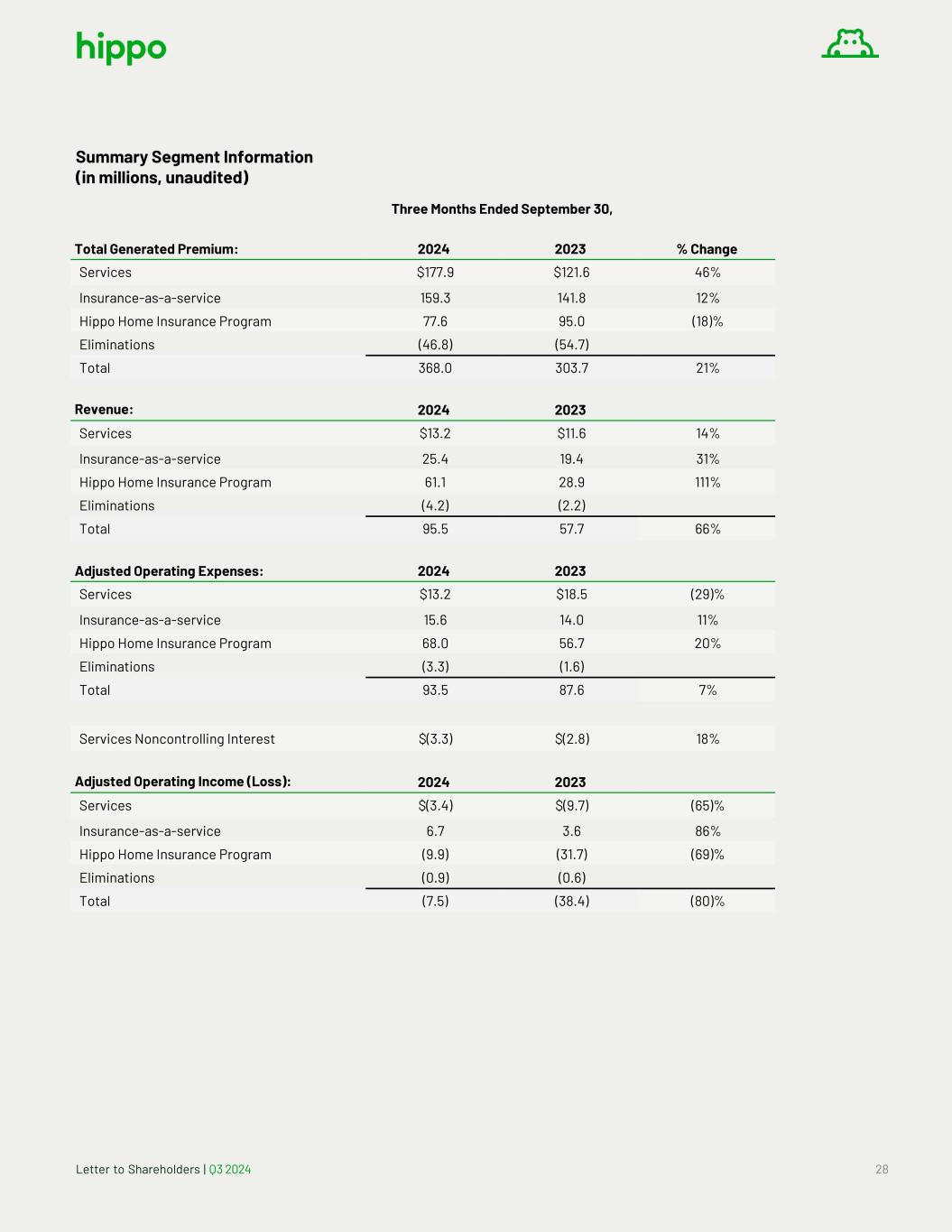 Letter to Shareholders | Q3 2024 28 Summary Segment Information (in millions, unaudited) Three Months Ended September 30, Total Generated Premium: 2024 2023 % Change Services $177.9 $121.6 46% Insurance-as-a-service 159.3 141.8 12% Hippo Home Insurance Program 77.6 95.0 (18)% Eliminations (46.8) (54.7) Total 368.0 303.7 21% Revenue: 2024 2023 Services $13.2 $11.6 14% Insurance-as-a-service 25.4 19.4 31% Hippo Home Insurance Program 61.1 28.9 111% Eliminations (4.2) (2.2) Total 95.5 57.7 66% Adjusted Operating Expenses: 2024 2023 Services $13.2 $18.5 (29)% Insurance-as-a-service 15.6 14.0 11% Hippo Home Insurance Program 68.0 56.7 20% Eliminations (3.3) (1.6) Total 93.5 87.6 7% Services Noncontrolling Interest $(3.3) $(2.8) 18% Adjusted Operating Income (Loss): 2024 2023 Services $(3.4) $(9.7) (65)% Insurance-as-a-service 6.7 3.6 86% Hippo Home Insurance Program (9.9) (31.7) (69)% Eliminations (0.9) (0.6) Total (7.5) (38.4) (80)%