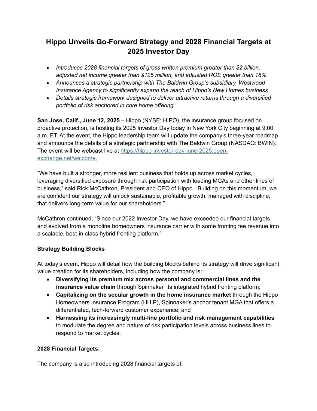 Hippo Unveils Go-Forward Strategy and 2028 Financial Targets at 2025 Investor Day • Introduces 2028 financial targets of gross written premium greater than $2 billion, adjusted net income greater than $125 million, and adjusted ROE greater than 18% • Announces a strategic partnership with The Baldwin Group’s subsidiary, Westwood Insurance Agency to significantly expand the reach of Hippo’s New Homes business • Details strategic framework designed to deliver attractive returns through a diversified portfolio of risk anchored in core home offering San Jose, Calif., June 12, 2025 – Hippo (NYSE: HIPO), the insurance group focused on proactive protection, is hosting its 2025 Investor Day today in New York City beginning at 9:00 a.m. ET. At the event, the Hippo leadership team will update the company’s three-year roadmap and announce the details of a strategic partnership with The Baldwin Group (NASDAQ: BWIN). The event will be webcast live at https://hippo-investor-day-june-2025.open- exchange.net/welcome. “We have built a stronger, more resilient business that holds up across market cycles, leveraging diversified exposure through risk participation with leading MGAs and other lines of business,” said Rick McCathron, President and CEO of Hippo. “Building on this momentum, we are confident our strategy will unlock sustainable, profitable growth, managed with discipline, that delivers long-term value for our shareholders.” McCathron continued, “Since our 2022 Investor Day, we have exceeded our financial targets and evolved from a monoline homeowners insurance carrier with some fronting fee revenue into a scalable, best-in-class hybrid fronting platform.” Strategy Building Blocks At today’s event, Hippo will detail how the building blocks behind its strategy will drive significant value creation for its shareholders, including how the company is: • Diversifying its premium mix across personal and commercial lines and the insurance value chain through Spinnaker, its integrated hybrid fronting platform; • Capitalizing on the secular growth in the home insurance market through the Hippo Homeowners Insurance Program (HHIP), Spinnaker’s anchor tenant MGA that offers a differentiated, tech-forward customer experience; and • Harnessing its increasingly multi-line portfolio and risk management capabilities to modulate the degree and nature of risk participation levels across business lines to respond to market cycles. 2028 Financial Targets: The company is also introducing 2028 financial targets of: