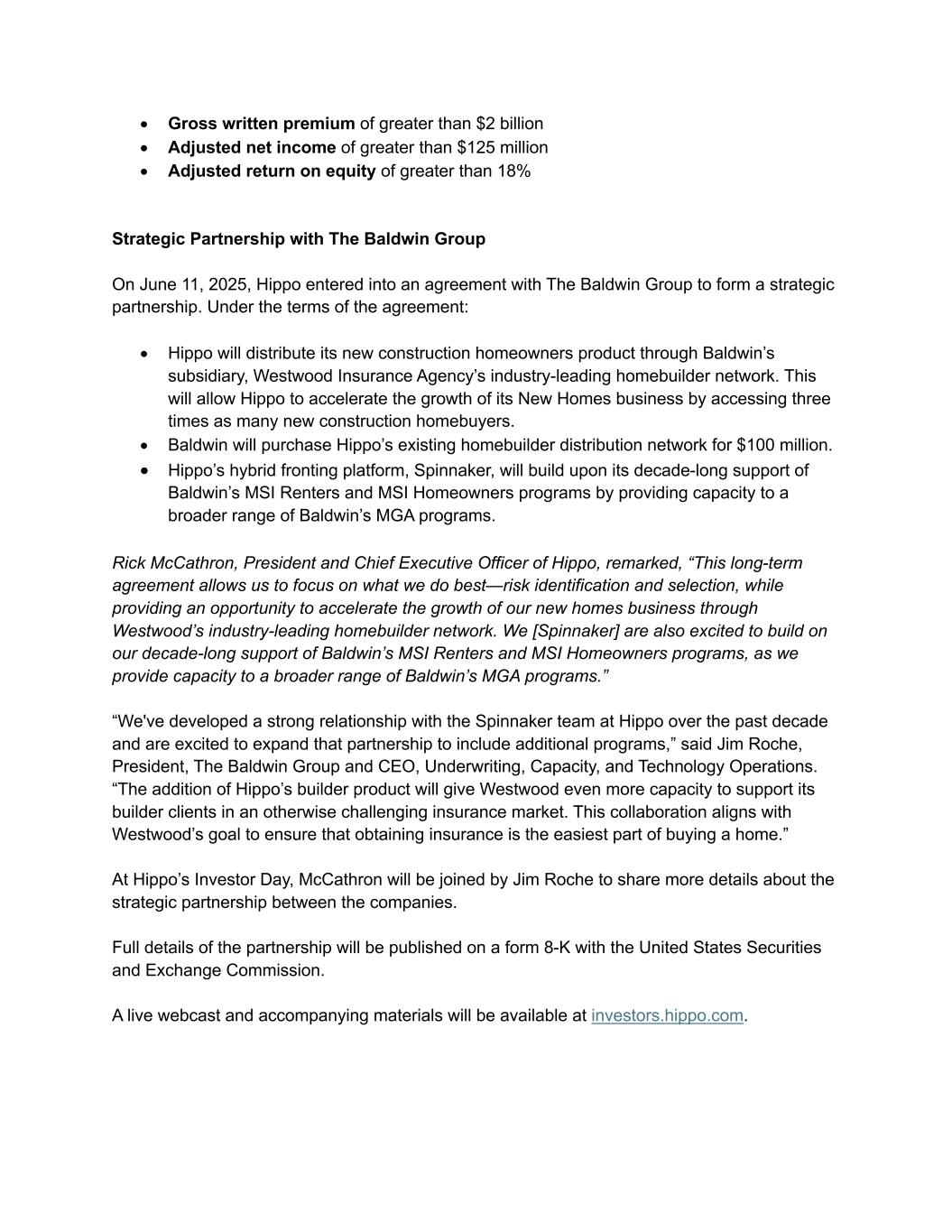 • Gross written premium of greater than $2 billion • Adjusted net income of greater than $125 million • Adjusted return on equity of greater than 18% Strategic Partnership with The Baldwin Group On June 11, 2025, Hippo entered into an agreement with The Baldwin Group to form a strategic partnership. Under the terms of the agreement: • Hippo will distribute its new construction homeowners product through Baldwin’s subsidiary, Westwood Insurance Agency’s industry-leading homebuilder network. This will allow Hippo to accelerate the growth of its New Homes business by accessing three times as many new construction homebuyers. • Baldwin will purchase Hippo’s existing homebuilder distribution network for $100 million. • Hippo’s hybrid fronting platform, Spinnaker, will build upon its decade-long support of Baldwin’s MSI Renters and MSI Homeowners programs by providing capacity to a broader range of Baldwin’s MGA programs. Rick McCathron, President and Chief Executive Officer of Hippo, remarked, “This long-term agreement allows us to focus on what we do best—risk identification and selection, while providing an opportunity to accelerate the growth of our new homes business through Westwood’s industry-leading homebuilder network. We [Spinnaker] are also excited to build on our decade-long support of Baldwin’s MSI Renters and MSI Homeowners programs, as we provide capacity to a broader range of Baldwin’s MGA programs.” “We've developed a strong relationship with the Spinnaker team at Hippo over the past decade and are excited to expand that partnership to include additional programs,” said Jim Roche, President, The Baldwin Group and CEO, Underwriting, Capacity, and Technology Operations. “The addition of Hippo’s builder product will give Westwood even more capacity to support its builder clients in an otherwise challenging insurance market. This collaboration aligns with Westwood’s goal to ensure that obtaining insurance is the easiest part of buying a home.” At Hippo’s Investor Day, McCathron will be joined by Jim Roche to share more details about the strategic partnership between the companies. Full details of the partnership will be published on a form 8-K with the United States Securities and Exchange Commission. A live webcast and accompanying materials will be available at investors.hippo.com.