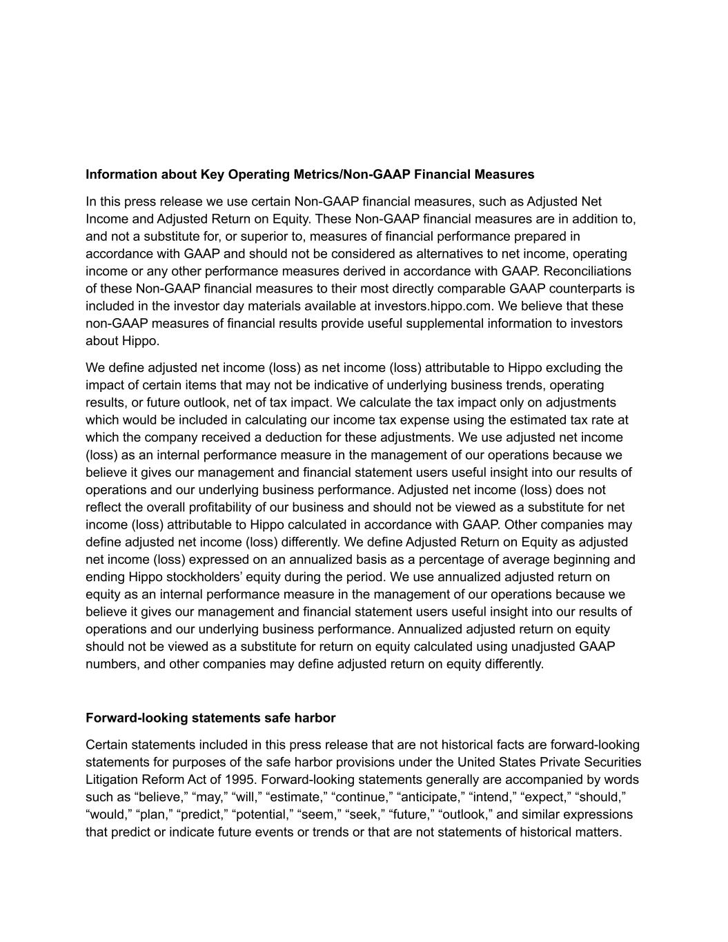 Information about Key Operating Metrics/Non-GAAP Financial Measures In this press release we use certain Non-GAAP financial measures, such as Adjusted Net Income and Adjusted Return on Equity. These Non-GAAP financial measures are in addition to, and not a substitute for, or superior to, measures of financial performance prepared in accordance with GAAP and should not be considered as alternatives to net income, operating income or any other performance measures derived in accordance with GAAP. Reconciliations of these Non-GAAP financial measures to their most directly comparable GAAP counterparts is included in the investor day materials available at investors.hippo.com. We believe that these non-GAAP measures of financial results provide useful supplemental information to investors about Hippo. We define adjusted net income (loss) as net income (loss) attributable to Hippo excluding the impact of certain items that may not be indicative of underlying business trends, operating results, or future outlook, net of tax impact. We calculate the tax impact only on adjustments which would be included in calculating our income tax expense using the estimated tax rate at which the company received a deduction for these adjustments. We use adjusted net income (loss) as an internal performance measure in the management of our operations because we believe it gives our management and financial statement users useful insight into our results of operations and our underlying business performance. Adjusted net income (loss) does not reflect the overall profitability of our business and should not be viewed as a substitute for net income (loss) attributable to Hippo calculated in accordance with GAAP. Other companies may define adjusted net income (loss) differently. We define Adjusted Return on Equity as adjusted net income (loss) expressed on an annualized basis as a percentage of average beginning and ending Hippo stockholders’ equity during the period. We use annualized adjusted return on equity as an internal performance measure in the management of our operations because we believe it gives our management and financial statement users useful insight into our results of operations and our underlying business performance. Annualized adjusted return on equity should not be viewed as a substitute for return on equity calculated using unadjusted GAAP numbers, and other companies may define adjusted return on equity differently. Forward-looking statements safe harbor Certain statements included in this press release that are not historical facts are forward-looking statements for purposes of the safe harbor provisions under the United States Private Securities Litigation Reform Act of 1995. Forward-looking statements generally are accompanied by words such as “believe,” “may,” “will,” “estimate,” “continue,” “anticipate,” “intend,” “expect,” “should,” “would,” “plan,” “predict,” “potential,” “seem,” “seek,” “future,” “outlook,” and similar expressions that predict or indicate future events or trends or that are not statements of historical matters.