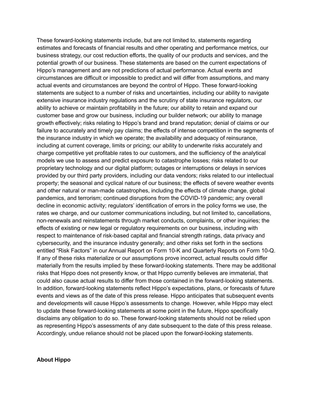 These forward-looking statements include, but are not limited to, statements regarding estimates and forecasts of financial results and other operating and performance metrics, our business strategy, our cost reduction efforts, the quality of our products and services, and the potential growth of our business. These statements are based on the current expectations of Hippo’s management and are not predictions of actual performance. Actual events and circumstances are difficult or impossible to predict and will differ from assumptions, and many actual events and circumstances are beyond the control of Hippo. These forward-looking statements are subject to a number of risks and uncertainties, including our ability to navigate extensive insurance industry regulations and the scrutiny of state insurance regulators, our ability to achieve or maintain profitability in the future; our ability to retain and expand our customer base and grow our business, including our builder network; our ability to manage growth effectively; risks relating to Hippo’s brand and brand reputation; denial of claims or our failure to accurately and timely pay claims; the effects of intense competition in the segments of the insurance industry in which we operate; the availability and adequacy of reinsurance, including at current coverage, limits or pricing; our ability to underwrite risks accurately and charge competitive yet profitable rates to our customers, and the sufficiency of the analytical models we use to assess and predict exposure to catastrophe losses; risks related to our proprietary technology and our digital platform; outages or interruptions or delays in services provided by our third party providers, including our data vendors; risks related to our intellectual property; the seasonal and cyclical nature of our business; the effects of severe weather events and other natural or man-made catastrophes, including the effects of climate change, global pandemics, and terrorism; continued disruptions from the COVID-19 pandemic; any overall decline in economic activity; regulators’ identification of errors in the policy forms we use, the rates we charge, and our customer communications including, but not limited to, cancellations, non-renewals and reinstatements through market conducts, complaints, or other inquiries; the effects of existing or new legal or regulatory requirements on our business, including with respect to maintenance of risk-based capital and financial strength ratings, data privacy and cybersecurity, and the insurance industry generally; and other risks set forth in the sections entitled “Risk Factors” in our Annual Report on Form 10-K and Quarterly Reports on Form 10-Q. If any of these risks materialize or our assumptions prove incorrect, actual results could differ materially from the results implied by these forward-looking statements. There may be additional risks that Hippo does not presently know, or that Hippo currently believes are immaterial, that could also cause actual results to differ from those contained in the forward-looking statements. In addition, forward-looking statements reflect Hippo’s expectations, plans, or forecasts of future events and views as of the date of this press release. Hippo anticipates that subsequent events and developments will cause Hippo’s assessments to change. However, while Hippo may elect to update these forward-looking statements at some point in the future, Hippo specifically disclaims any obligation to do so. These forward-looking statements should not be relied upon as representing Hippo’s assessments of any date subsequent to the date of this press release. Accordingly, undue reliance should not be placed upon the forward-looking statements. About Hippo