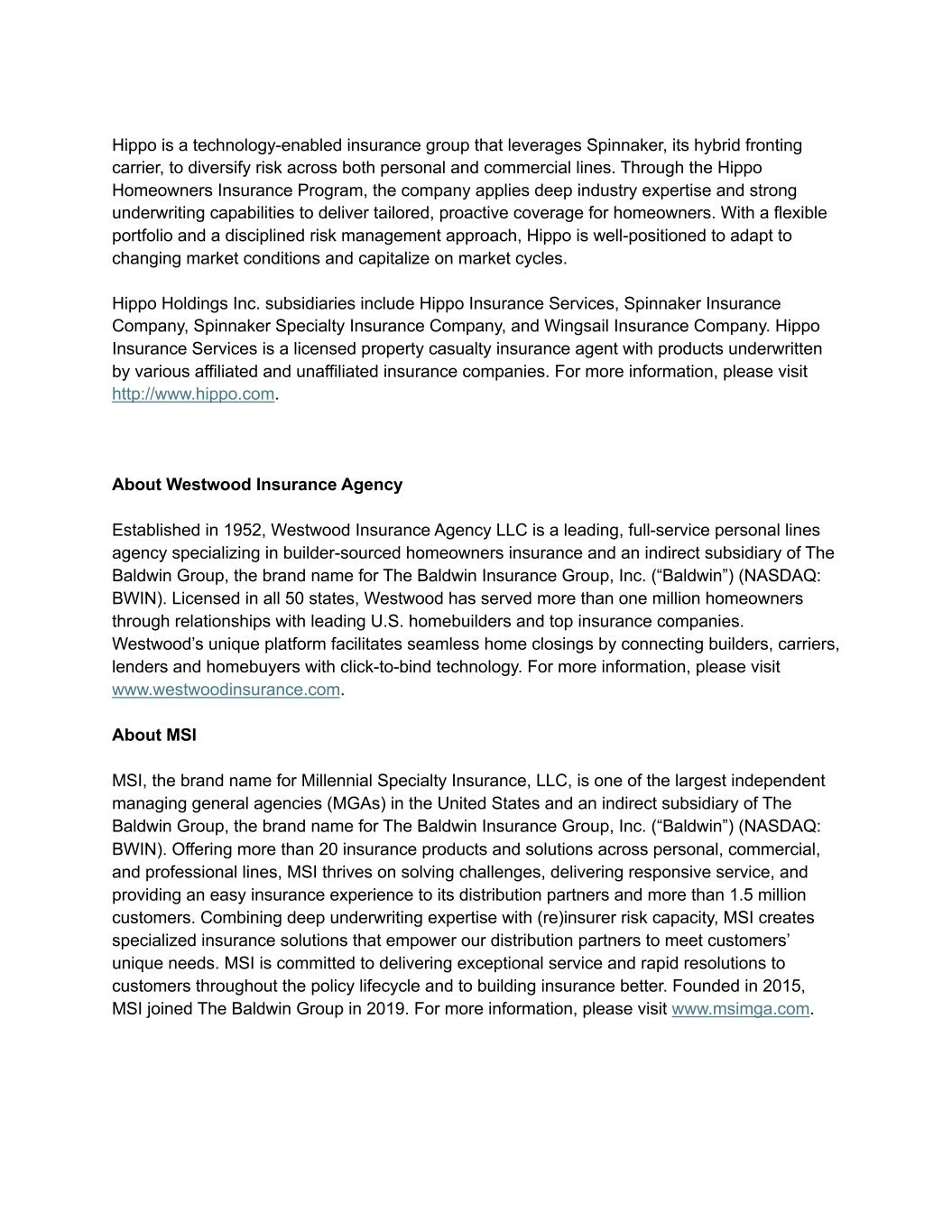 Hippo is a technology-enabled insurance group that leverages Spinnaker, its hybrid fronting carrier, to diversify risk across both personal and commercial lines. Through the Hippo Homeowners Insurance Program, the company applies deep industry expertise and strong underwriting capabilities to deliver tailored, proactive coverage for homeowners. With a flexible portfolio and a disciplined risk management approach, Hippo is well-positioned to adapt to changing market conditions and capitalize on market cycles. Hippo Holdings Inc. subsidiaries include Hippo Insurance Services, Spinnaker Insurance Company, Spinnaker Specialty Insurance Company, and Wingsail Insurance Company. Hippo Insurance Services is a licensed property casualty insurance agent with products underwritten by various affiliated and unaffiliated insurance companies. For more information, please visit http://www.hippo.com. About Westwood Insurance Agency Established in 1952, Westwood Insurance Agency LLC is a leading, full-service personal lines agency specializing in builder-sourced homeowners insurance and an indirect subsidiary of The Baldwin Group, the brand name for The Baldwin Insurance Group, Inc. (“Baldwin”) (NASDAQ: BWIN). Licensed in all 50 states, Westwood has served more than one million homeowners through relationships with leading U.S. homebuilders and top insurance companies. Westwood’s unique platform facilitates seamless home closings by connecting builders, carriers, lenders and homebuyers with click-to-bind technology. For more information, please visit www.westwoodinsurance.com. About MSI MSI, the brand name for Millennial Specialty Insurance, LLC, is one of the largest independent managing general agencies (MGAs) in the United States and an indirect subsidiary of The Baldwin Group, the brand name for The Baldwin Insurance Group, Inc. (“Baldwin”) (NASDAQ: BWIN). Offering more than 20 insurance products and solutions across personal, commercial, and professional lines, MSI thrives on solving challenges, delivering responsive service, and providing an easy insurance experience to its distribution partners and more than 1.5 million customers. Combining deep underwriting expertise with (re)insurer risk capacity, MSI creates specialized insurance solutions that empower our distribution partners to meet customers’ unique needs. MSI is committed to delivering exceptional service and rapid resolutions to customers throughout the policy lifecycle and to building insurance better. Founded in 2015, MSI joined The Baldwin Group in 2019. For more information, please visit www.msimga.com.