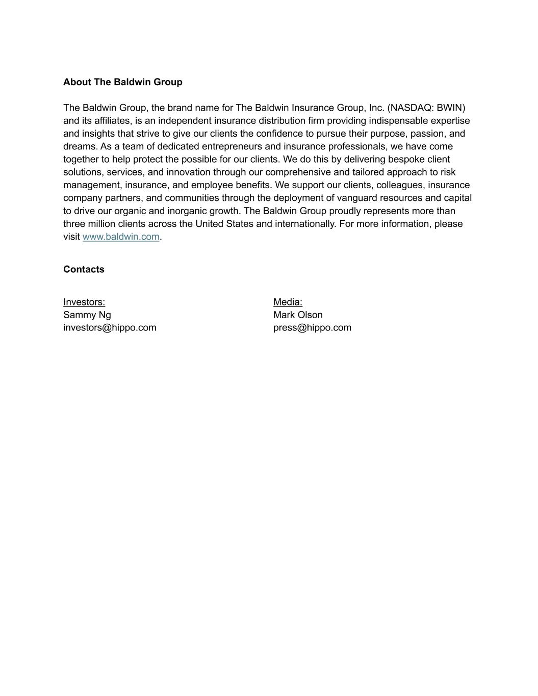 About The Baldwin Group The Baldwin Group, the brand name for The Baldwin Insurance Group, Inc. (NASDAQ: BWIN) and its affiliates, is an independent insurance distribution firm providing indispensable expertise and insights that strive to give our clients the confidence to pursue their purpose, passion, and dreams. As a team of dedicated entrepreneurs and insurance professionals, we have come together to help protect the possible for our clients. We do this by delivering bespoke client solutions, services, and innovation through our comprehensive and tailored approach to risk management, insurance, and employee benefits. We support our clients, colleagues, insurance company partners, and communities through the deployment of vanguard resources and capital to drive our organic and inorganic growth. The Baldwin Group proudly represents more than three million clients across the United States and internationally. For more information, please visit www.baldwin.com. Contacts Investors: Sammy Ng investors@hippo.com Media: Mark Olson press@hippo.com