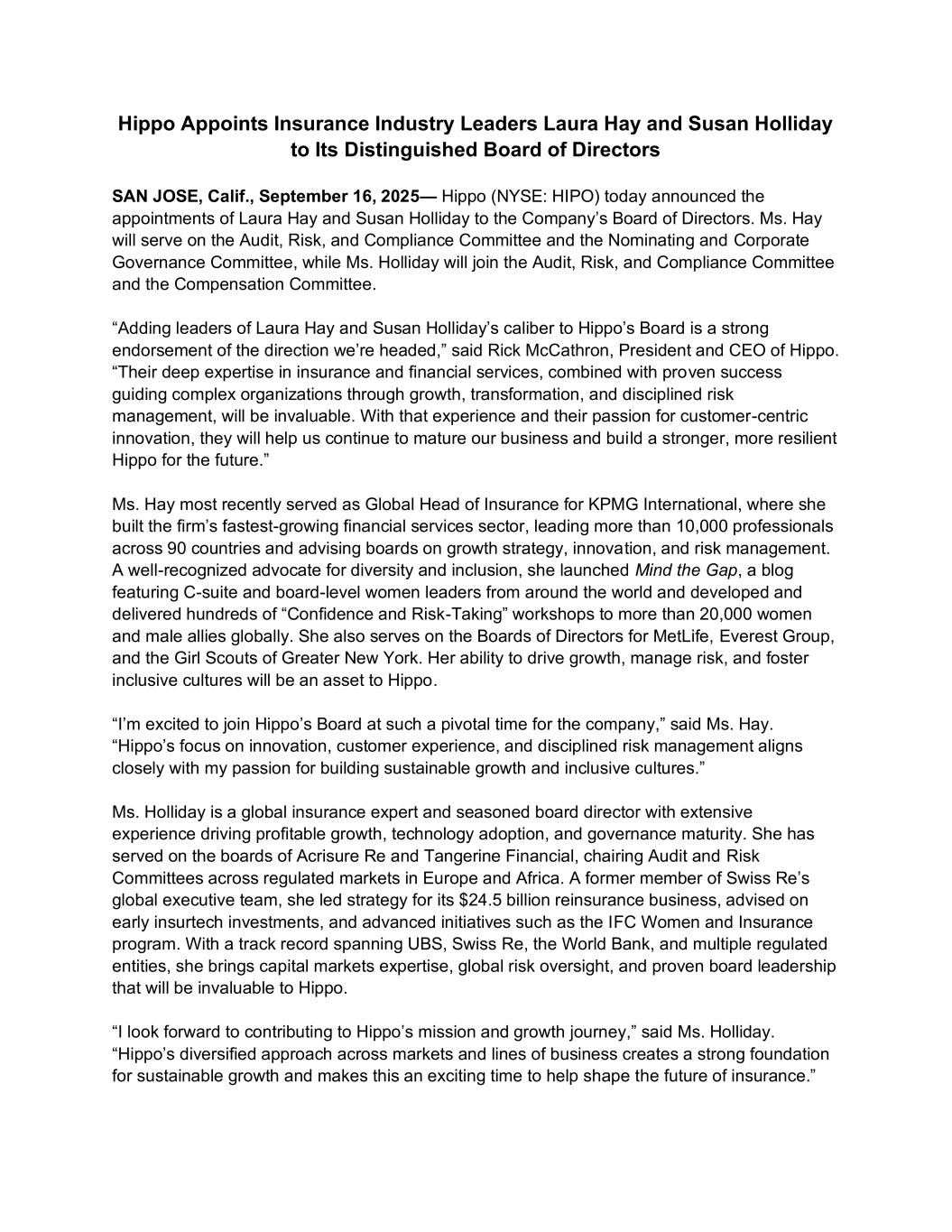 Hippo Appoints Insurance Industry Leaders Laura Hay and Susan Holliday to Its Distinguished Board of Directors SAN JOSE, Calif., September 16, 2025— Hippo (NYSE: HIPO) today announced the appointments of Laura Hay and Susan Holliday to the Company’s Board of Directors. Ms. Hay will serve on the Audit, Risk, and Compliance Committee and the Nominating and Corporate Governance Committee, while Ms. Holliday will join the Audit, Risk, and Compliance Committee and the Compensation Committee. “Adding leaders of Laura Hay and Susan Holliday’s caliber to Hippo’s Board is a strong endorsement of the direction we’re headed,” said Rick McCathron, President and CEO of Hippo. “Their deep expertise in insurance and financial services, combined with proven success guiding complex organizations through growth, transformation, and disciplined risk management, will be invaluable. With that experience and their passion for customer-centric innovation, they will help us continue to mature our business and build a stronger, more resilient Hippo for the future.” Ms. Hay most recently served as Global Head of Insurance for KPMG International, where she built the firm’s fastest-growing financial services sector, leading more than 10,000 professionals across 90 countries and advising boards on growth strategy, innovation, and risk management. A well-recognized advocate for diversity and inclusion, she launched Mind the Gap, a blog featuring C-suite and board-level women leaders from around the world and developed and delivered hundreds of “Confidence and Risk-Taking” workshops to more than 20,000 women and male allies globally. She also serves on the Boards of Directors for MetLife, Everest Group, and the Girl Scouts of Greater New York. Her ability to drive growth, manage risk, and foster inclusive cultures will be an asset to Hippo. “I’m excited to join Hippo’s Board at such a pivotal time for the company,” said Ms. Hay. “Hippo’s focus on innovation, customer experience, and disciplined risk management aligns closely with my passion for building sustainable growth and inclusive cultures.” Ms. Holliday is a global insurance expert and seasoned board director with extensive experience driving profitable growth, technology adoption, and governance maturity. She has served on the boards of Acrisure Re and Tangerine Financial, chairing Audit and Risk Committees across regulated markets in Europe and Africa. A former member of Swiss Re’s global executive team, she led strategy for its $24.5 billion reinsurance business, advised on early insurtech investments, and advanced initiatives such as the IFC Women and Insurance program. With a track record spanning UBS, Swiss Re, the World Bank, and multiple regulated entities, she brings capital markets expertise, global risk oversight, and proven board leadership that will be invaluable to Hippo. “I look forward to contributing to Hippo’s mission and growth journey,” said Ms. Holliday. “Hippo’s diversified approach across markets and lines of business creates a strong foundation for sustainable growth and makes this an exciting time to help shape the future of insurance.”