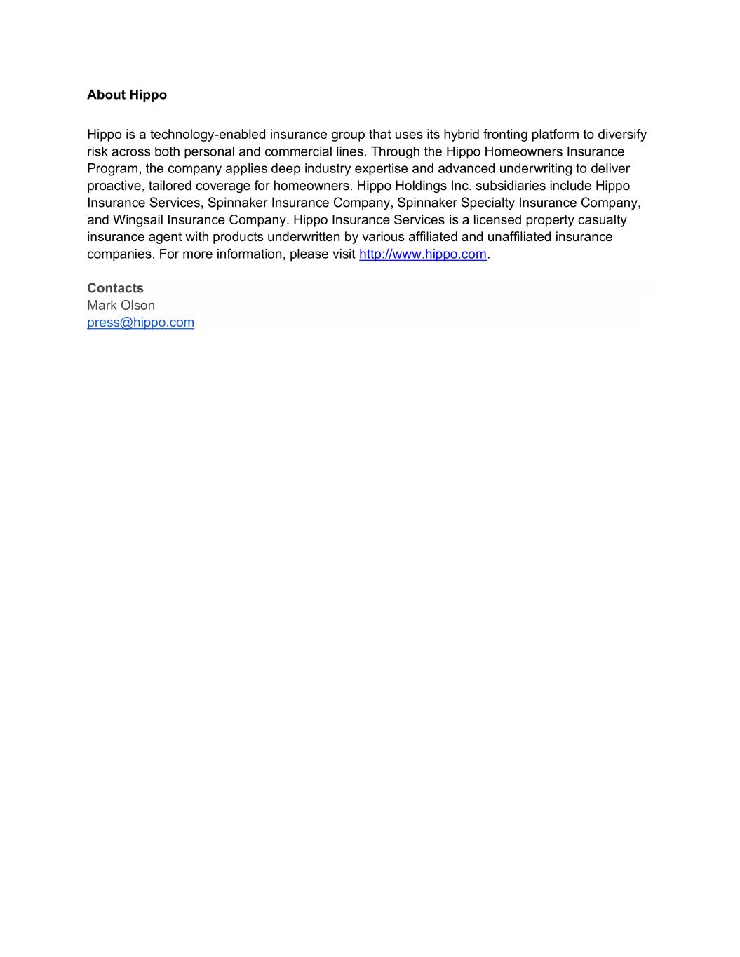 About Hippo Hippo is a technology-enabled insurance group that uses its hybrid fronting platform to diversify risk across both personal and commercial lines. Through the Hippo Homeowners Insurance Program, the company applies deep industry expertise and advanced underwriting to deliver proactive, tailored coverage for homeowners. Hippo Holdings Inc. subsidiaries include Hippo Insurance Services, Spinnaker Insurance Company, Spinnaker Specialty Insurance Company, and Wingsail Insurance Company. Hippo Insurance Services is a licensed property casualty insurance agent with products underwritten by various affiliated and unaffiliated insurance companies. For more information, please visit http://www.hippo.com. Contacts Mark Olson press@hippo.com