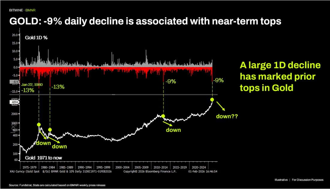 “Thus, non-fundamental factors are arguably more the factors explaining the weakness in ETH prices. Foremost, in our view, is that leverage has not returned yet to crypto as the October 10th ripple effects continue. The second factor is the surge in precious metals prices, which have acted as a ‘vortex’ sucking away risk appetite from crypto. That said, Gold seems to be following 1979-1980 closely. What confirmed the top in January 1980 was a -13% daily decline on January 22, 1980. On January 30, 2026, Gold fell -9%, its 4th largest ever daily decline. Each of the prior 3 larger declines marked a near-term top,” said Lee.