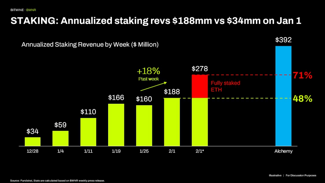 As of February 1, 2026, Bitmine total staked ETH stands at 2,897,459 ($6.7 billion at $2,317 per ETH). This is an increase of 888,192 in the past week. “Bitmine has staked more ETH than other entities in the world. At scale (when Bitmine’s ETH is fully staked by MAVAN and its staking partners), the ETH staking rewards is $374 million annually (using 2.81% CESR), or greater than $1 million per day,” stated Lee.
