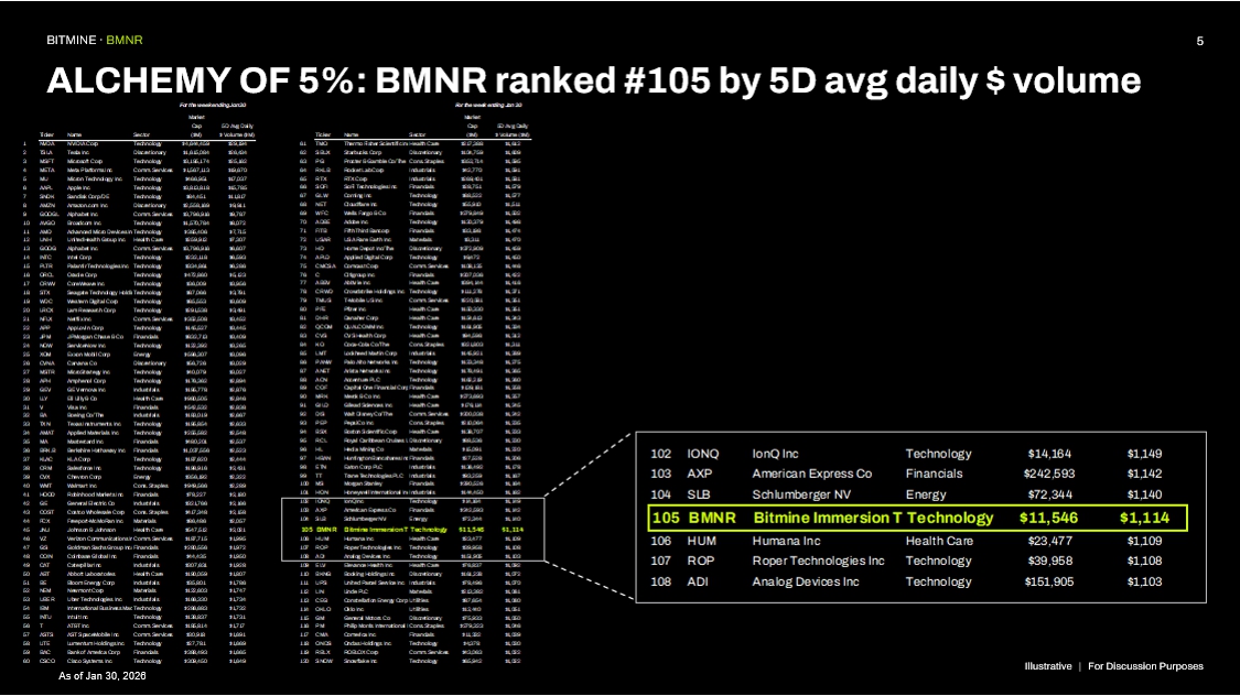 Bitmine is one of the most widely traded stocks in the US. According to data from Fundstrat, the stock has traded average daily dollar volume of $1.1 billion (5-day average, as of January 30, 2026), ranking #105 in the US, behind Schlumberger NV (rank #104) and ahead of Humana (rank #106) among 5,704 US-listed stocks (statista.com and Fundstrat research).