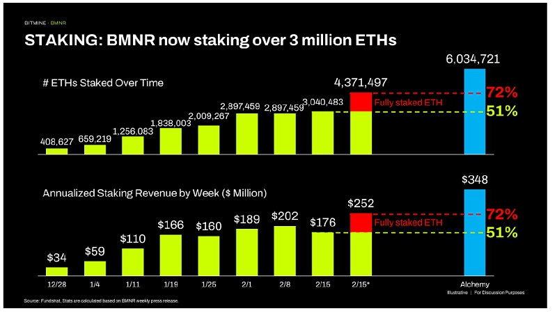 As of February 16, 2026, Bitmine total staked ETH stands at 3,040,483 ($6.1 billion at $1,998 per ETH). “Bitmine has staked more ETH than other entities in the world. At scale (when Bitmine’s ETH is fully staked by MAVAN and its staking partners), the ETH staking rewards is $252 million annually (using 2.89% 7-day BMNR yield),” stated Lee.