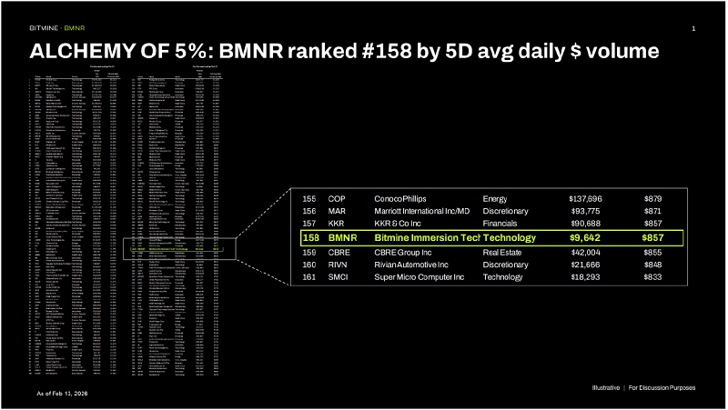 Bitmine is one of the most widely traded stocks in the US. According to data from Fundstrat, the stock has traded average daily dollar volume of $0.9 billion (5-day average, as of February 13, 2026), ranking #158 in the US, behind KKR (rank #157) and ahead of CBRE (rank #159) among 5,704 US-listed stocks (statista.com and Fundstrat research).