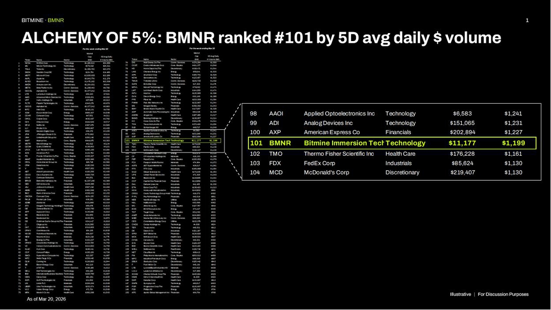 Bitmine is one of the most widely traded stocks in the US. According to data from Fundstrat, the stock has traded average daily dollar volume of $1.2 billion (5-day average, as of March 20, 2026), ranking #101 in the US, behind American Express (rank #100) and ahead of Thermo Fisher Scientific (rank #102) among 5,704 US-listed stocks (statista.com and Fundstrat research).