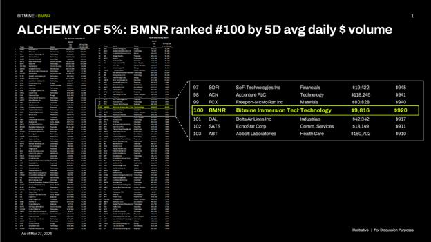 Bitmine is one of the most widely traded stocks in the US. According to data from Fundstrat, the stock has traded average daily dollar volume of $920 million (5-day average, as of March 27, 2026), ranking #100 in the US, behind Freeport McMoRan (rank #99) and ahead of Delta Airlines (rank #101) among 5,704 US-listed stocks (statista.com and Fundstrat research).