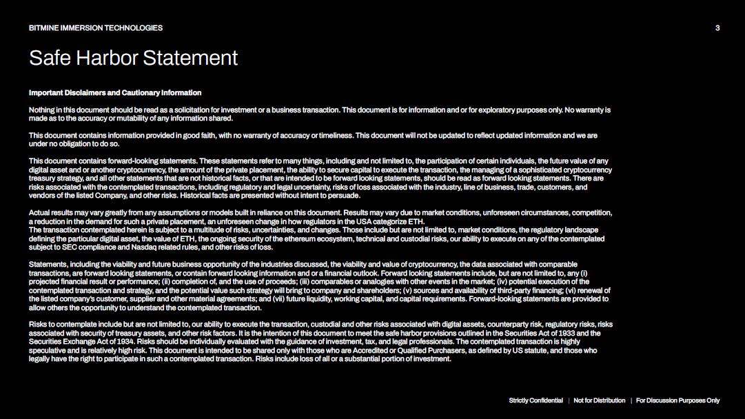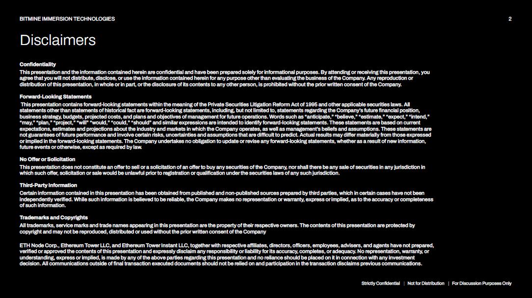 Confidentiality This presentation and the information contained herein are confidential and have been prepared solely for informational purposes. By attending or receiving this presentation, you agree that you will not distribute, disclose, or use the information contained herein for any purpose other than evaluating the business of the Company. Any reproduction or distribution of this presentation, in whole or in part, or the disclosure of its contents to any other person, is prohibited without the prior written consent of the Company. Forward - Looking Statements This presentation contains forward - looking statements within the meaning of the Private Securities Litigation Reform Act of 1995 and other applicable securities laws. All statements other than statements of historical fact are forward - looking statements, including, but not limited to, statements regarding the Company’s future financial position, business strategy, budgets, projected costs, and plans and objectives of management for future operations. Words such as “anticipate,” “believe,” “estimate,” “expect,” “intend,” “may,” “plan,” “project,” “will” “would,” “could,” “should” and similar expressions are intended to identify forward - looking statements. These statements are based on current expectations, estimates and projections about the industry and markets in which the Company operates, as well as management’s beliefs and assumptions. These statements are not guarantees of future performance and involve certain risks, uncertainties and assumptions that are difficult to predict. Actual results may differ materially from those expressed or implied in the forward - looking statements. The Company undertakes no obligation to update or revise any forward - looking statements, whether as a result of new information, future events or otherwise, except as required by law. No Offer or Solicitation This presentation does not constitute an offer to sell or a solicitation of an offer to buy any securities of the Company, nor shall there be any sale of securities in any jurisdiction in which such offer, solicitation or sale would be unlawful prior to registration or qualification under the securities laws of any such jurisdiction. Third - Party Information Certain information contained in this presentation has been obtained from published and non - published sources prepared by third parties, which in certain cases have not been independently verified. While such information is believed to be reliable, the Company makes no representation or warranty, express or implied, as to the accuracy or completeness of such information. Trademarks and Copyrights All trademarks, service marks and trade names appearing in this presentation are the property of their respective owners. The contents of this presentation are protected by copyright and may not be reproduced, distributed or used without the prior written consent of the Company ETH Node Corp., Ethereum Tower LLC, and Ethereum Tower Instant LLC, together with respective affiliates, directors, officers, employees, advisers, and agents have not prepared, verified or approved the contents of this presentation and expressly disclaim any responsibility or liability for its accuracy, completes, or adequacy. No representation, warranty, or understanding, express or implied, is made by any of the above parties regarding this presentation and no reliance should be placed on it in connection with any investment decision. All communications outside of final transaction executed documents should not be relied on and participation in the transaction disclaims previous communications. Strictly Confidential | Not for Distribution | For Discussion Purposes Only 2 BITMINE IMMERSION TECHNOLOGIES Disclaimers