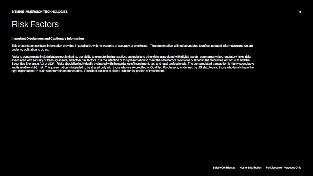 Important Disclaimers and Cautionary Information Nothing in this document should be read as a solicitation for investment or a business transaction. This document is for information and or for exploratory purposes only. No warranty is made as to the accuracy or mutability of any information shared. This document contains information provided in good faith, with no warranty of accuracy or timeliness. This document will not be updated to reflect updated information and we are under no obligation to do so. This document contains forward - looking statements. These statements refer to many things, including and not limited to, the participation of certain individuals, the future value of any digital asset and or another cryptocurrency, the amount of the private placement, the ability to secure capital to execute the transaction, the managing of a sophisticated cryptocurrency treasury strategy, and all other statements that are not historical facts, or that are intended to be forward looking statements, should be read as forward looking statements. There are risks associated with the contemplated transactions, including regulatory and legal uncertainty, risks of loss associated with the industry, line of business, trade, customers, and vendors of the listed Company, and other risks. Historical facts are presented without intent to persuade. Actual results may vary greatly from any assumptions or models built in reliance on this document. Results may vary due to market conditions, unforeseen circumstances, competition, a reduction in the demand for such a private placement, an unforeseen change in how regulators in the USA categorize ETH. The transaction contemplated herein is subject to a multitude of risks, uncertainties, and changes. Those include but are not limited to, market conditions, the regulatory landscape defining the particular digital asset, the value of ETH, the ongoing security of the ethereum ecosystem, technical and custodial risks, our ability to execute on any of the contemplated subject to SEC compliance and Nasdaq related rules, and other risks of loss. Statements, including the viability and future business opportunity of the industries discussed, the viability and value of cryptocurrency, the data associated with comparable transactions, are forward looking statements, or contain forward looking information and or a financial outlook. Forward looking statements include, but are not limited to, any (i) projected financial result or performance; (ii) completion of, and the use of proceeds; (iii) comparables or analogies with other events in the market; (iv) potential execution of the contemplated transaction and strategy, and the potential value such strategy will bring to company and shareholders; (v) sources and availability of third - party financing; (vi) renewal of the listed company’s customer, supplier and other material agreements; and (vii) future liquidity, working capital, and capital requirements. Forward - looking statements are provided to allow others the opportunity to understand the contemplated transaction. Risks to contemplate include but are not limited to, our ability to execute the transaction, custodial and other risks associated with digital assets, counterparty risk, regulatory risks, risks associated with security of treasury assets, and other risk factors. It is the intention of this document to meet the safe harbor provisions outlined in the Securities Act of 1933 and the Securities Exchange Act of 1934. Risks should be individually evaluated with the guidance of investment, tax, and legal professionals. The contemplated transaction is highly speculative and is relatively high risk. This document is intended to be shared only with those who are Accredited or Qualified Purchasers, as defined by US statute, and those who legally have the right to participate in such a contemplated transaction. Risks include loss of all or a substantial portion of investment. Strictly Confidential | Not for Distribution | For Discussion Purposes Only 3 BITMINE IMMERSION TECHNOLOGIES Safe Harbor Statement