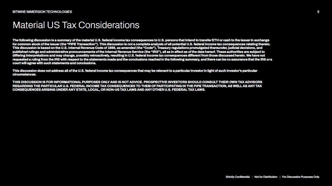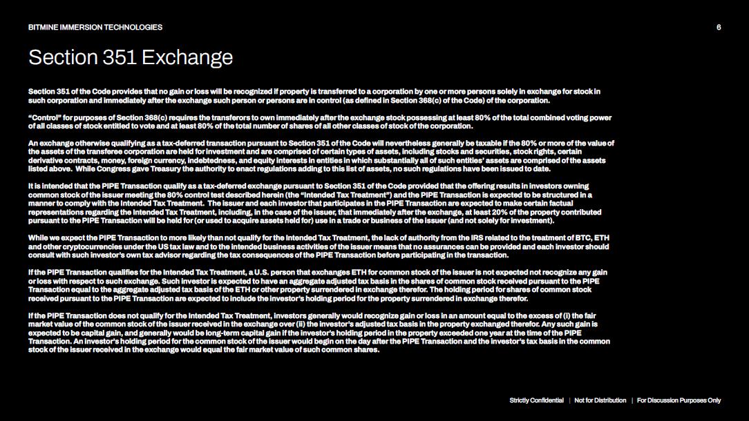 The following discussion is a summary of the material U.S. federal income tax consequences to U.S. persons that intend to transfer ETH or cash to the issuer in exchange for common stock of the issuer (the “PIPE Transaction”). This discussion is not a complete analysis of all potential U.S. federal income tax consequences relating thereto. This discussion is based on the U.S. Internal Revenue Code of 1986, as amended (the “Code”), Treasury regulations promulgated thereunder, judicial decisions, and published rulings and administrative pronouncements of the Internal Revenue Service (the “IRS”), all as in effect as of the date hereof. These authorities are subject to differing interpretations and may change, possibly retroactively, resulting in U.S. federal income tax consequences different from those discussed herein. We have not requested a ruling from the IRS with respect to the statements made and the conclusions reached in the following summary, and there can be no assurance that the IRS or a court will agree with such statements and conclusions. This discussion does not address all of the U.S. federal income tax consequences that may be relevant to a particular investor in light of such investor’s particular circumstances. THIS DISCUSSION IS FOR INFORMATIONAL PURPOSES ONLY AND IS NOT ADVICE . PROSPECTIVE INVESTORS SHOULD CONSULT THEIR OWN TAX ADVISORS REGARDING THE PARTICULAR U . S . FEDERAL INCOME TAX CONSEQUENCES TO THEM OF PARTICIPATING IN THE PIPE TRANSACTION, AS WELL AS ANY TAX CONSEQUENCES ARISING UNDER ANY STATE, LOCAL, OR NON - US TAX LAWS AND ANY OTHER U . S . FEDERAL TAX LAWS . Strictly Confidential | Not for Distribution | For Discussion Purposes Only 5 BITMINE IMMERSION TECHNOLOGIES Material US Tax Considerations
